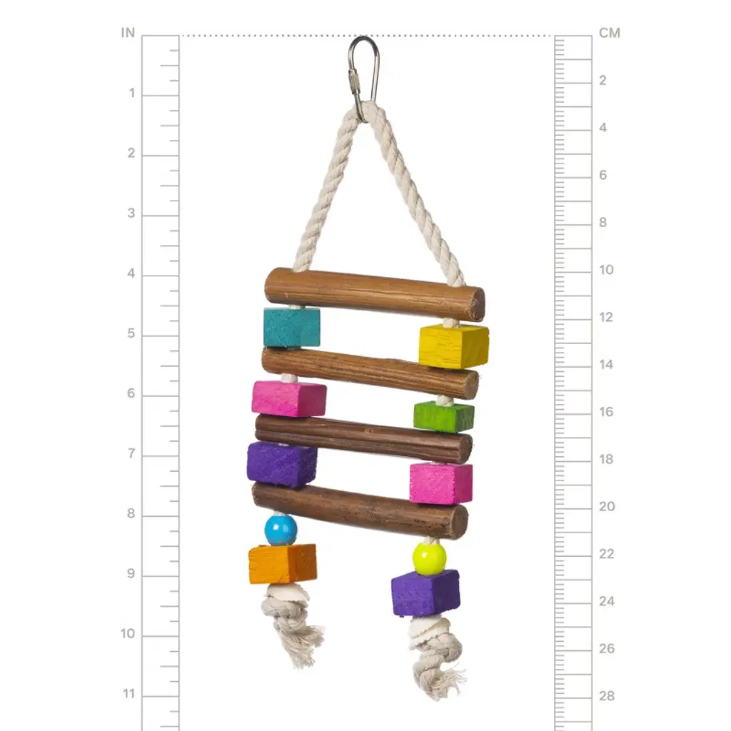 Prevue Pet Products Bodacious Bites Chow 60942 are an ideal beak exercise toy comprised of solid natural hardwood strung together with cotton rope or leather strips. Additional materials include leather shapes, plastic beads, sea shells and knotted ropes. These toys are finished with 100% safe FD&C colors and attach with quick-links. Intended for small to medium sized birds. Prevue Pet Products Bodacious Bites Chow measures approximately 4" Wide and 10-1/2" High.