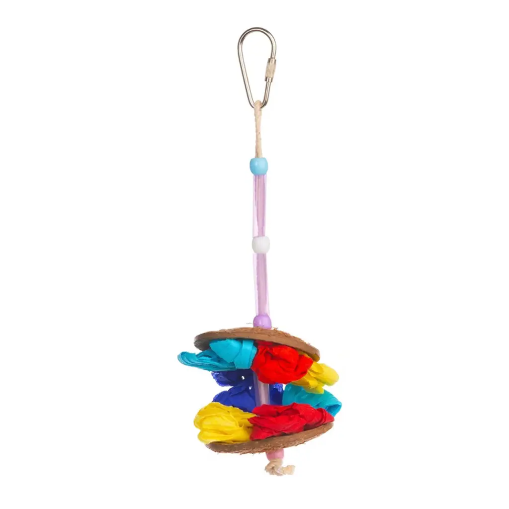 Prevue Pet Products Appeteaser 62519 is a colorful, dangling pull toy designed for satisfying preening instincts and discouraging plucking in your bird. Our Appeteaser toy is made from an assortment of straw, cotton twine, and multicolored paper providing your bird with mental stimulation and hours of fun. The coconut shell and plastic beads are perfect for beak and tongue exercise. All materials are 100% pet safe with non-toxic, food-grade colors and connect easily to cage with stainless steel quick-link attachments– actual measurements may vary slightly. As always, supervise birds at play. Our Appeteaser toy measures 3" diameter and 3" high. Ideal for x-small, small, and medium birds measuring 4" to 18" beak to tail.