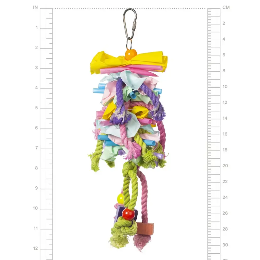 Prevue Pet Products Calypso Creations Short Stack Bird Toy 62605 is a colorful, dangling toy to shred and pull, satisfying preening instincts and discouraging plucking in your bird. Made from a variety of materials, including knotted rope, wooden blocks, crinkly paper and more. Birds love to pull these toys apart and unravel the materials! All materials are 100% pet safe, non-toxic with food grade colors and connect easily to cage with quick-link attachments. Toy is hand made and actual measurements may vary slightly. As always, supervise birds at play. Our Calypso Creations Short Stack Bird Toy is approximately 12" Long and 4 1/2" Wide, ideal for small birds.