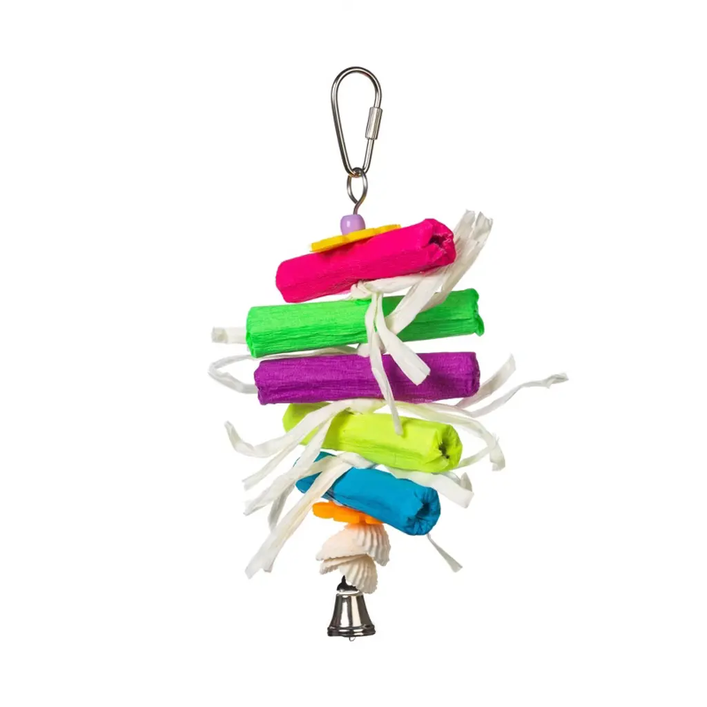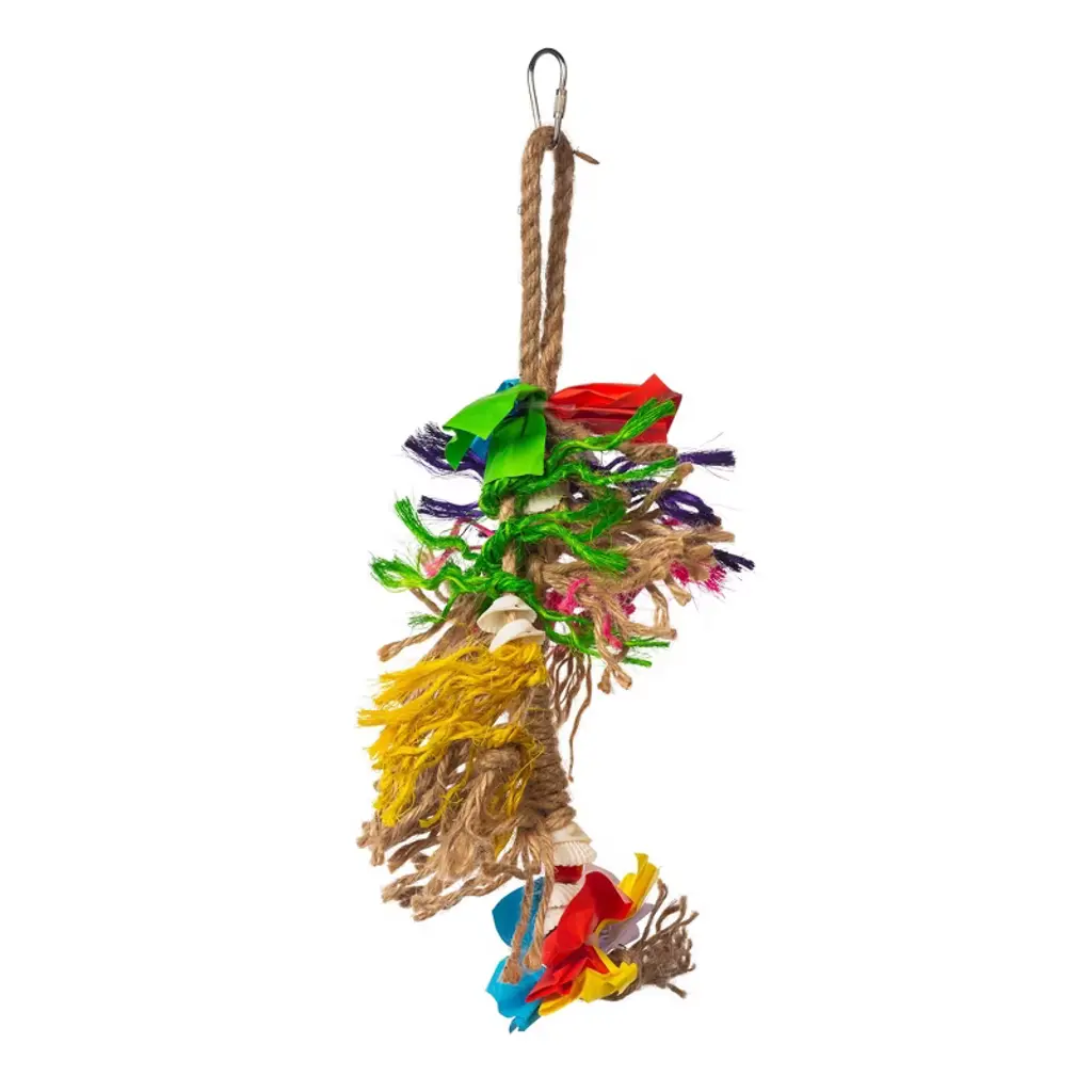 Prevue Pet Products Bodacious Bites Banquet bird toy 62475 will provide hours of foot and beak exercise as your bird pulls, chomps and grips a variety of shapes and textures. Designed to provide mental and physical stimulation, Bodacious Bites Banquet is made from solid hardwood strung together with cotton rope and featuring plastic beads. All materials are 100% pet safe, made with food grade coloring and quick-link attachments letting you easily connect toy to cage. Our bird toys are handmade and actual measurements may vary slightly. As always, supervise birds at play. Our Bodacious Bites Banquet bird toy is approximately 5 1/4" wide and 21" high, ideal for medium, large and extra large birds.