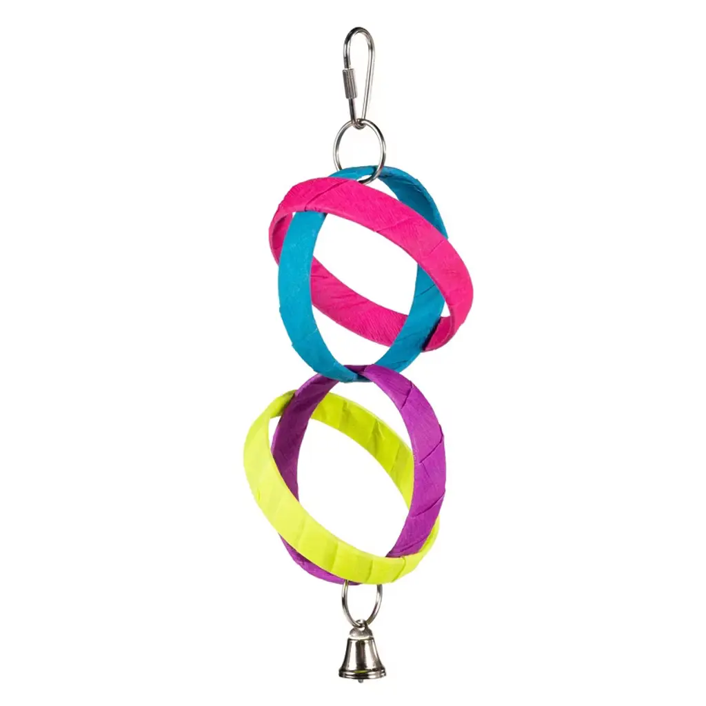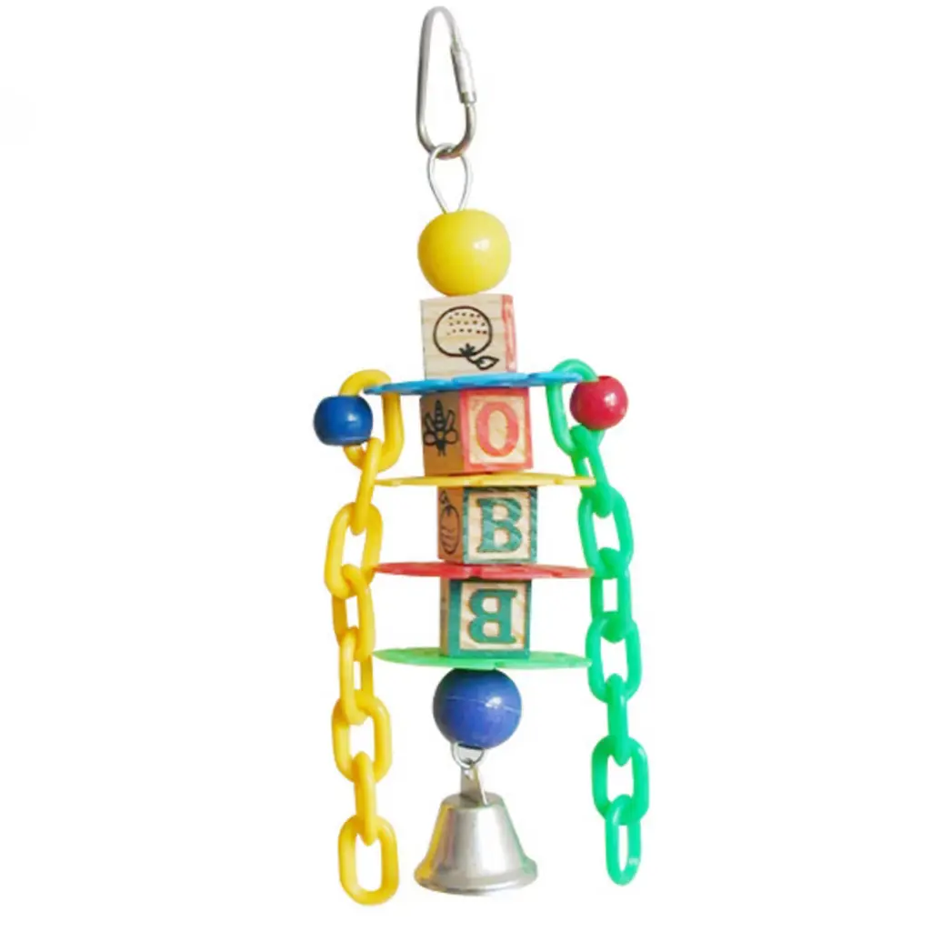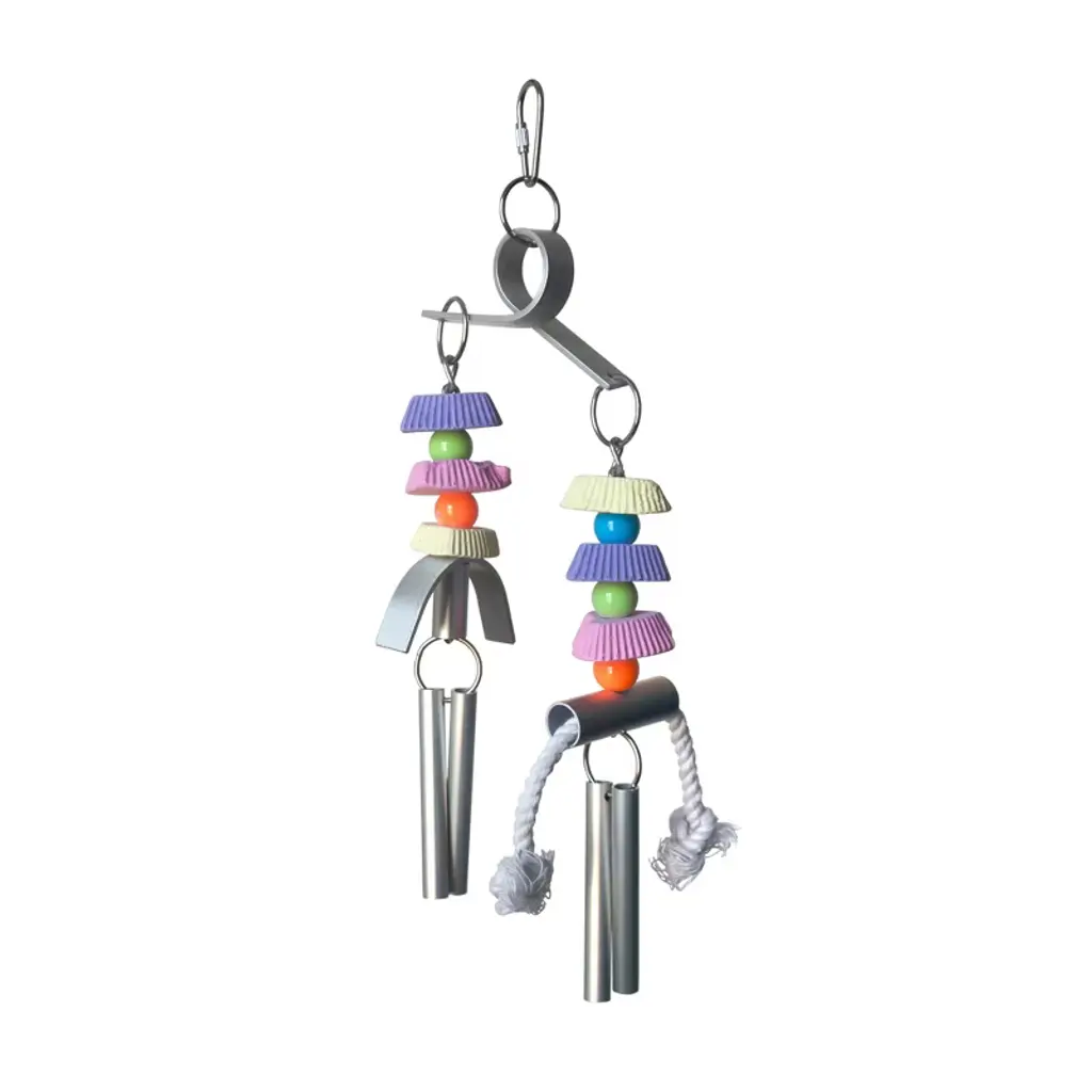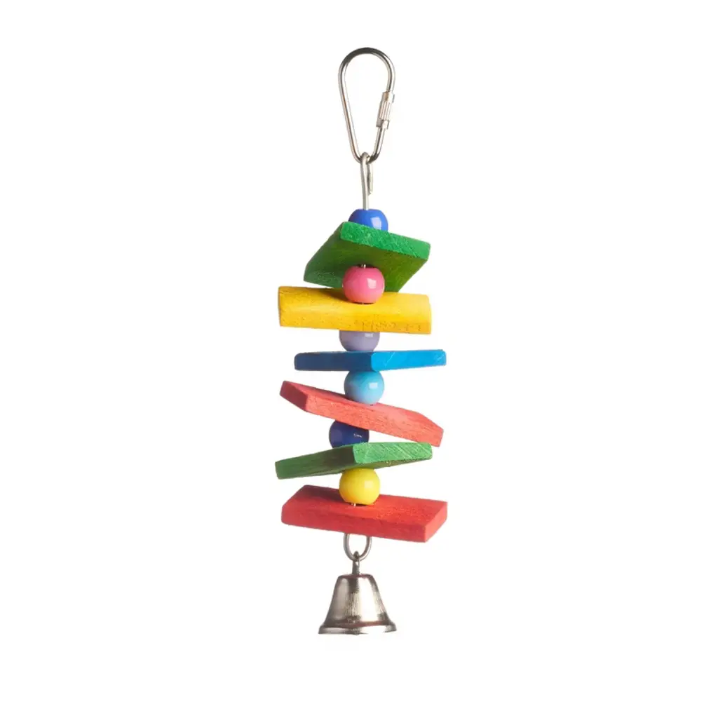 Prevue Pet Products Bodacious Bites Ding Bird Toy 60950 will provide hours of foot and beak exercise as your bird pulls, chomps and grips a variety of shapes and textures. Designed to provide mental and physical stimulation, Bodacious Bites Ding is made from solid hardwood, plastic beads and features a bird safe bell. All materials are 100% safe, made with food grade coloring and quick-link attachments letting you easily connect toy to cage. Our bird toys are handmade and actual measurements may vary slightly. As always, supervise birds at play. Our Bodacious Bites Ding bird toy is approximately 2 1/4" long, 1 1/4" wide and 7 1/2" high, ideal for Extra Small and Small birds.