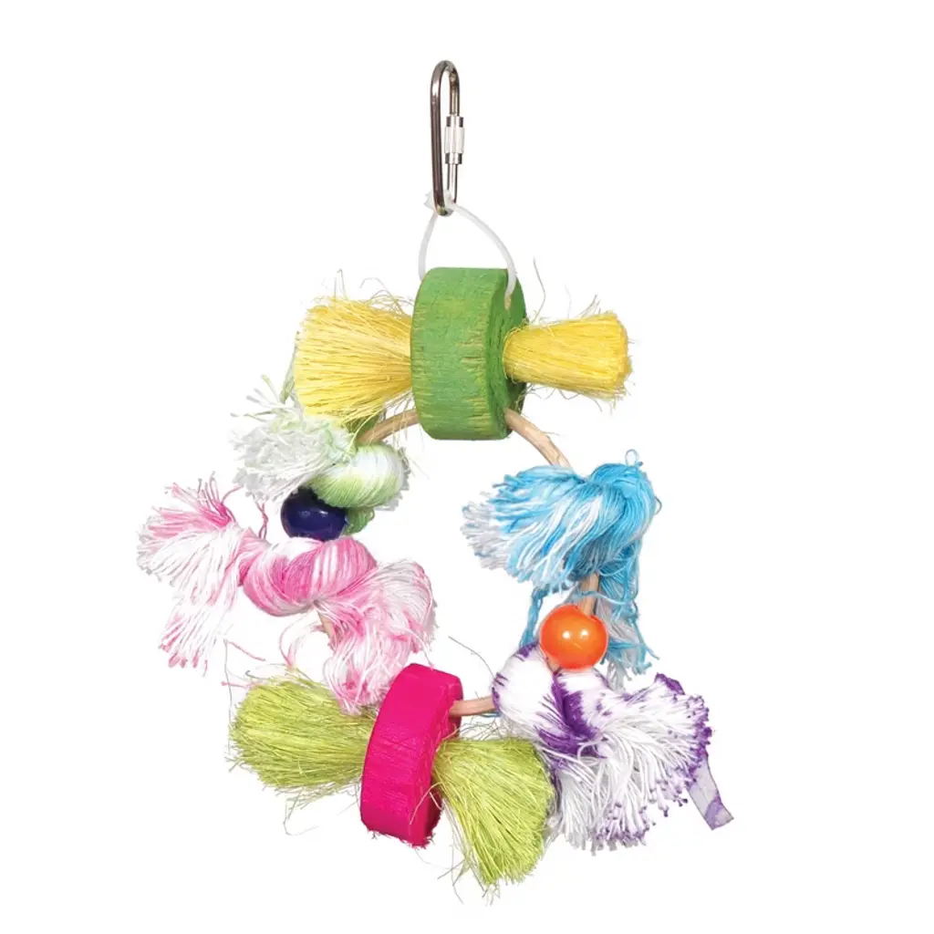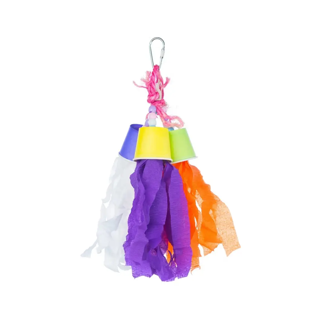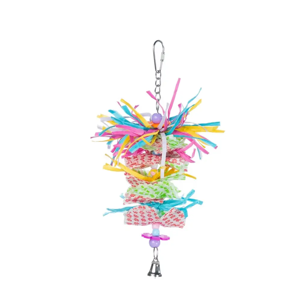 Prevue Pet Products Playfuls Miami Frost 62674 is a colorful, dangling pull toy designed for satisfying preening instincts and discouraging plucking in your bird. Miami Frost is made from an assortment of multicolor papers and Rafia Rope providing your bird with mental stimulation and hours of fun. The plastic beads and stainless bell add extra elements of distraction. All materials are 100% pet safe with non-toxic, food-grade colors and connect easily to cage with stainless steel quick-link attachments– actual measurements may vary slightly. As always, supervise birds at play. Our Miami Frost bird toy measures 5" diameter and 7 1/2" high. Ideal for x-small, small, and medium birds measuring 4" to 18" beak to tail.