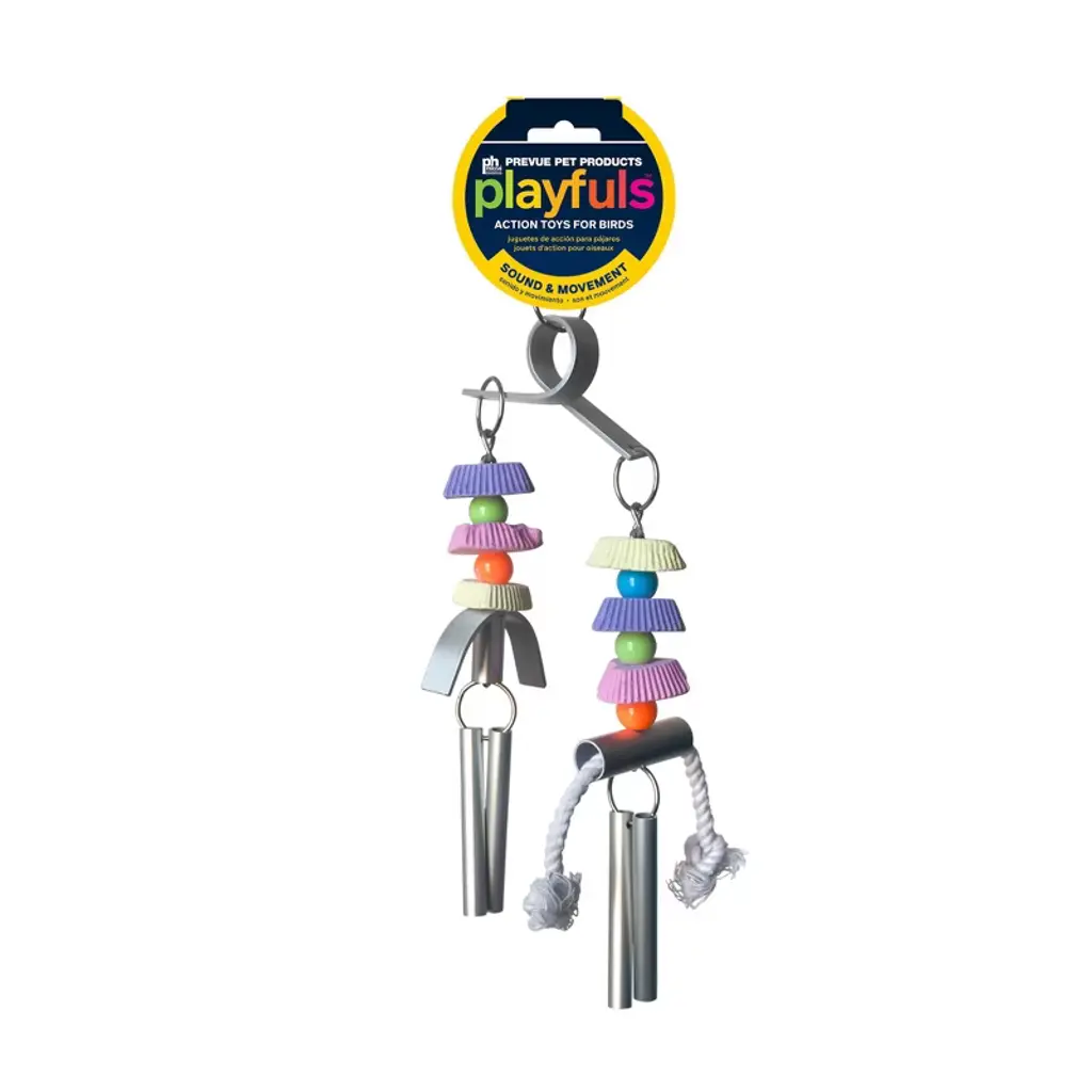 Prevue Pet Products Chime Time Typhoon Bird Toy 62155 will stimulate your bird"s senses with delightful sounds and bright colors. Indestructible wind chime style toys will keep your bird entertained for hours with aluminum chimes decorated with beads, rubber rings and calcium wafers. All materials are 100-percent safe and non-toxic. Toy connects easily to cage with quick-link attachment and actual measurements may vary slightly. As always, supervise birds at play. Our Typhoon 62155 bird toy is approximately 4" Wide and 11" High, ideal for small to medium sized birds.