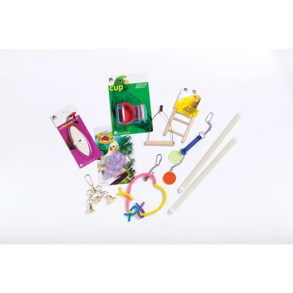 Prevue Pet Products Round Roof White Bird Cage Kit 91102 contains everything you need to keep your bird safe and entertained! Our Round Roof Cage Kit includes two hooded plastic cups, two plastic perches, one cuttlebone, one solid wood ladder, one mineral treat and a variety of toys. Measures 13 1/2" Long, 11" Wide, 16" High with 3/8" wire spacing, designed for small birds. Toys and accessories may vary from picture.