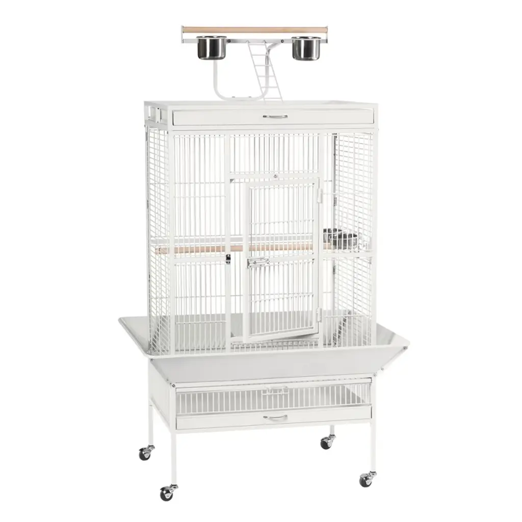 Prevue Pet Products powder-coated steel construction Select Cage 3153C in Chalk White offers quality craftsmanship at an affordable cost. Powder-coated steel construction with a cagetop playstand to keep your bird entertained and content, the heavy-duty push button lock keeps your bird securely inside its cage when playtime is over. This select bird cage also includes four stainless steel cups, two wood perches and a castered stand for portability. Both trays and bottom grille are removable for ease of cleaning while the rounded corner seed guards control mess around the cage. Our powder-coated steel construction Select Cage in Chalk White measures 30" long, 22" wide, 63" high with 3/4" wire spacing.