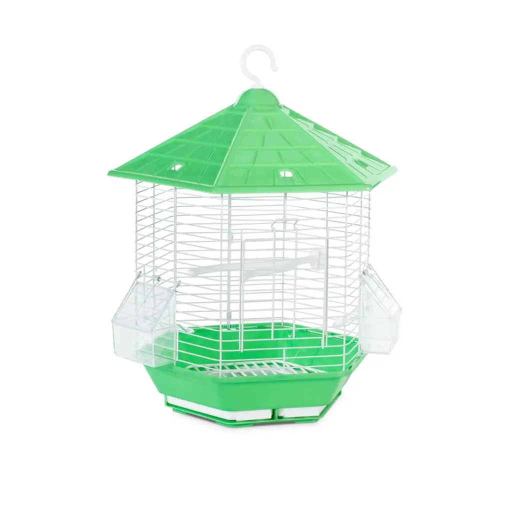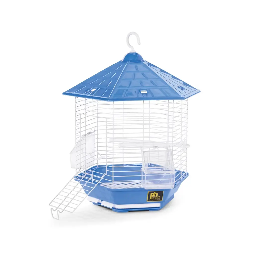 Prevue Pet Products Bali Bird Cage Blue SP31997 is a uniquely styled home for your Finches, canary or small parakeet. Vibrant blue in color, this playful cage comes complete with a swing, plastic perch and two hooded cups. Drop down front door provides easy access into the cage while the split trays pull out for easy cleaning. Our Bali bird cage measures 10" in diameter and 16-3/4" high to the top of the finial. Non-toxic, powder coated, wire mesh with 3/8" wire spacing.