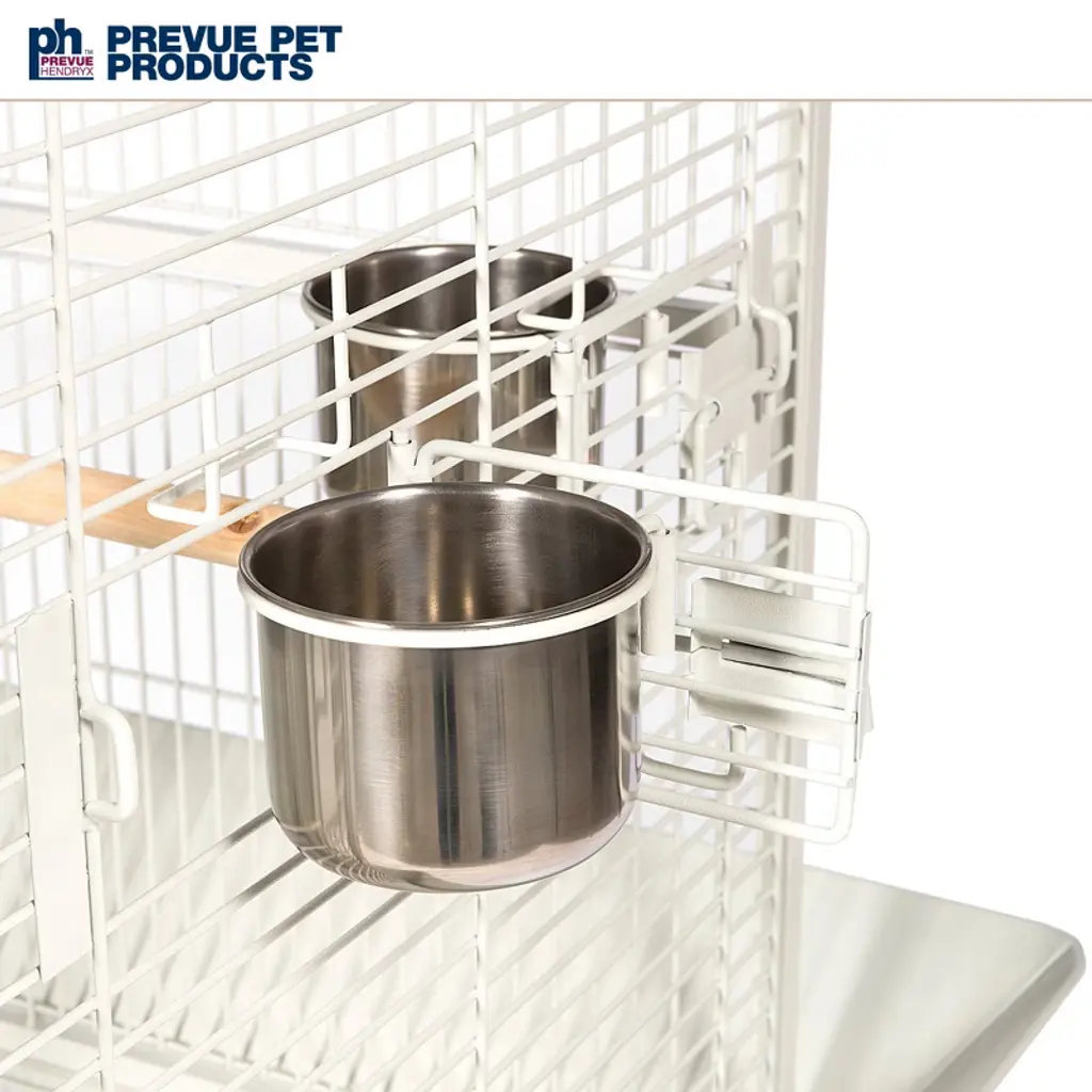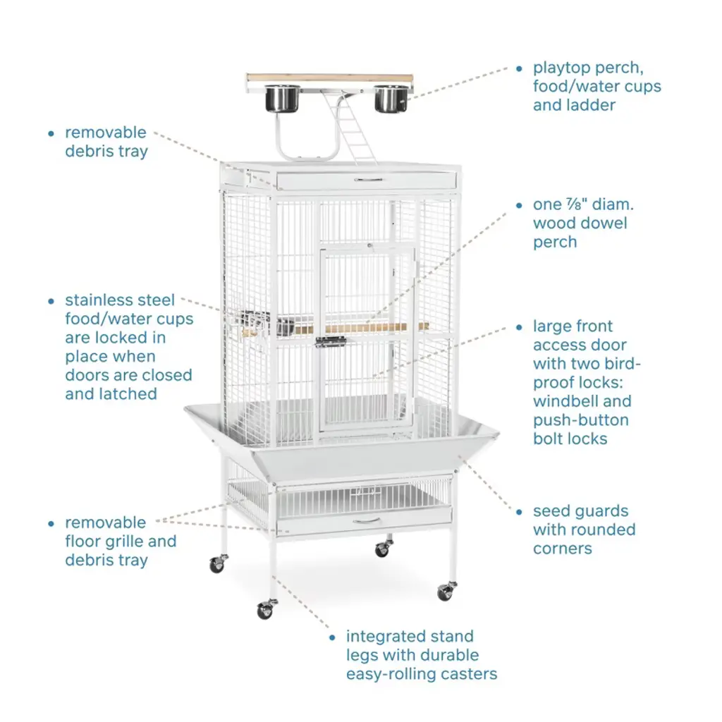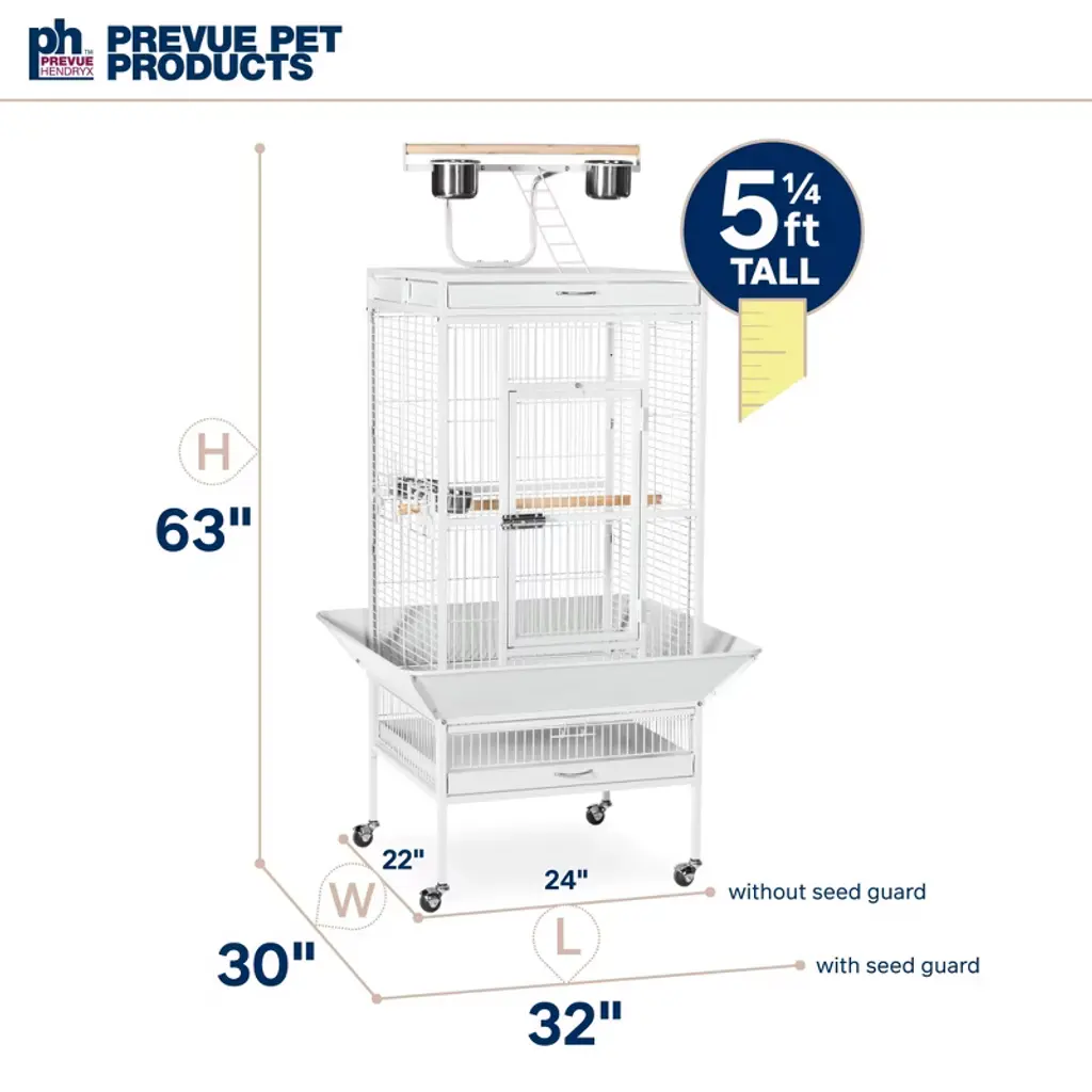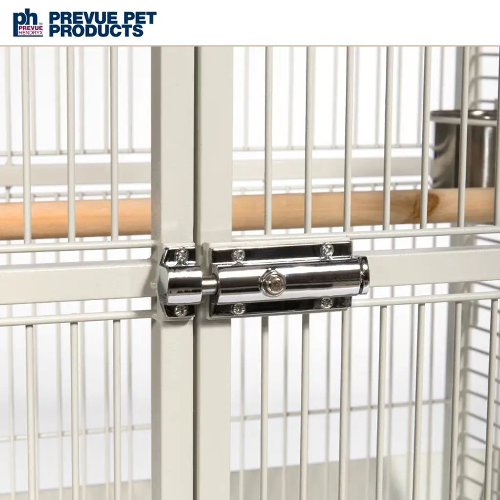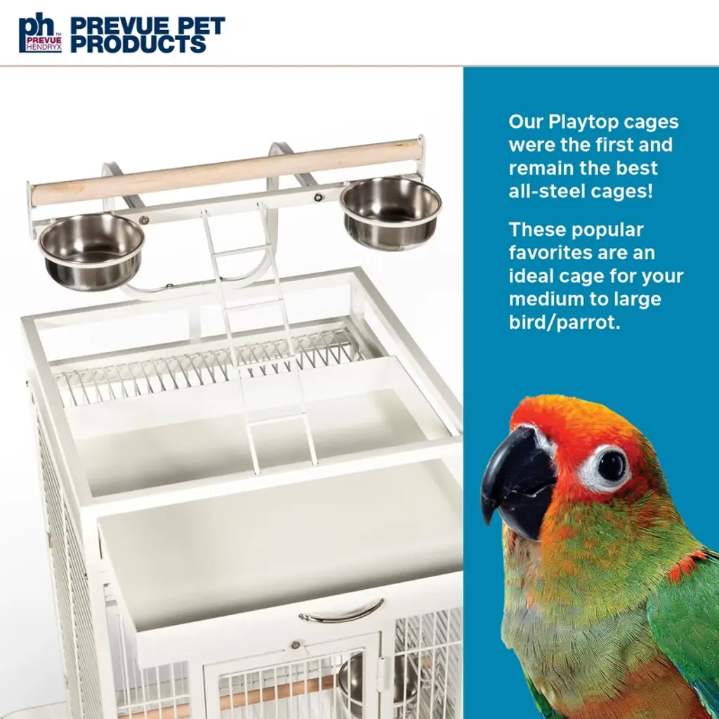Prevue Pet Products powder-coated steel construction Select Cage 3152C in Chalk White offers quality craftsmanship at an affordable cost. Powder-coated steel construction of with a cagetop playstand to keep your bird entertained and content, the heavy-duty push button lock keeps your bird securely inside its cage when playtime is over. This select bird cage also includes four stainless steel cups, two wood perches and a castered stand for portability. Both trays and bottom grille are removable for ease of cleaning while the rounded corner seed guards control mess around the cage. Our powder-coated steel construction Select Cage in Chalk White measures 24" long, 22" wide, 65" high with 3/4" wire spacing.