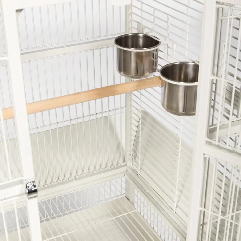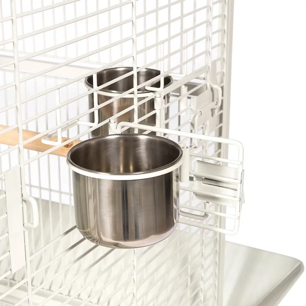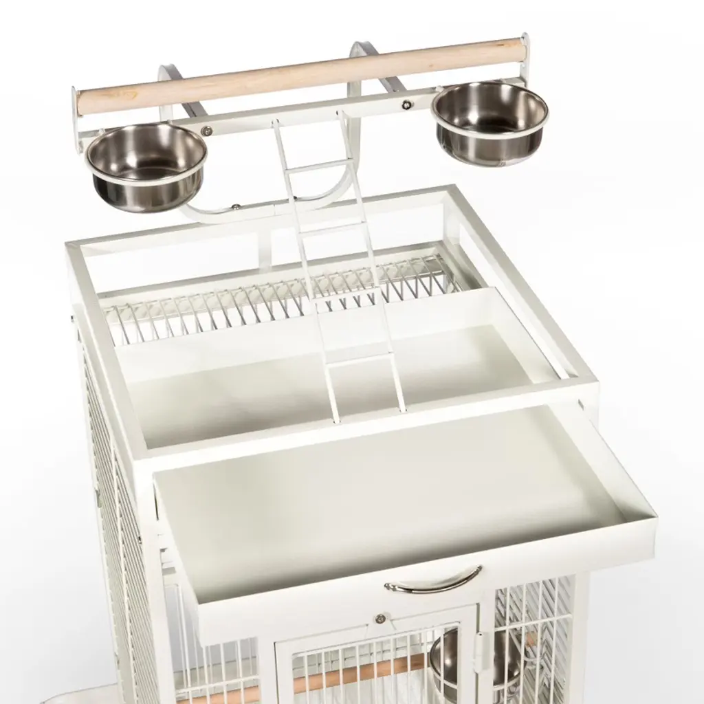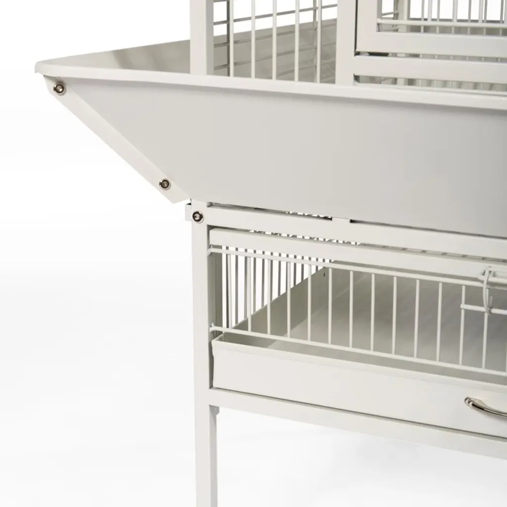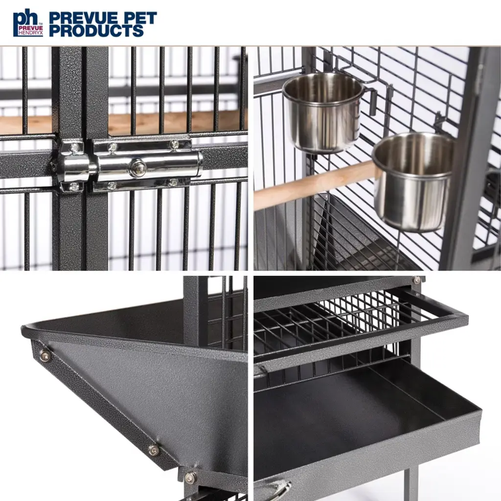 Prevue Pet Products powder-coated steel construction Select Cage 3152C in Chalk White offers quality craftsmanship at an affordable cost. Powder-coated steel construction of with a cagetop playstand to keep your bird entertained and content, the heavy-duty push button lock keeps your bird securely inside its cage when playtime is over. This select bird cage also includes four stainless steel cups, two wood perches and a castered stand for portability. Both trays and bottom grille are removable for ease of cleaning while the rounded corner seed guards control mess around the cage. Our powder-coated steel construction Select Cage in Chalk White measures 24" long, 22" wide, 65" high with 3/4" wire spacing.