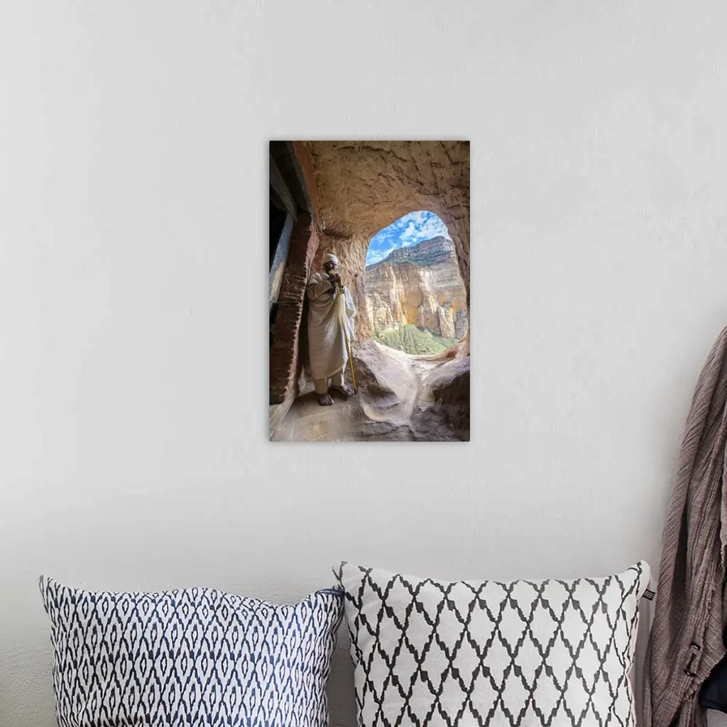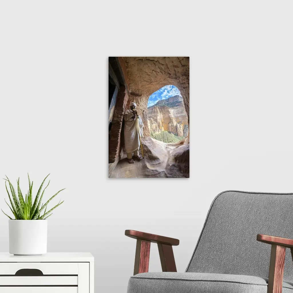 Ethiopian Orthodox priest holding the hand cross at entrance of Abuna Yemata Guh church, Gheralta Mountains, Tigray, Ethiopia, Africa