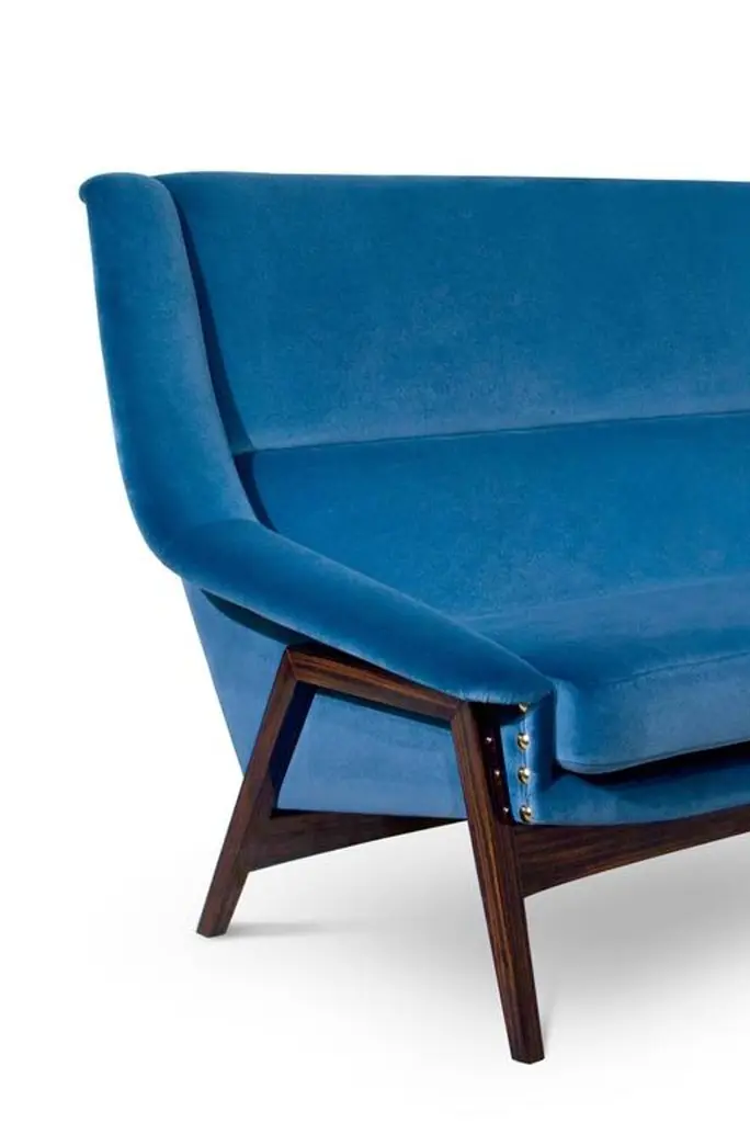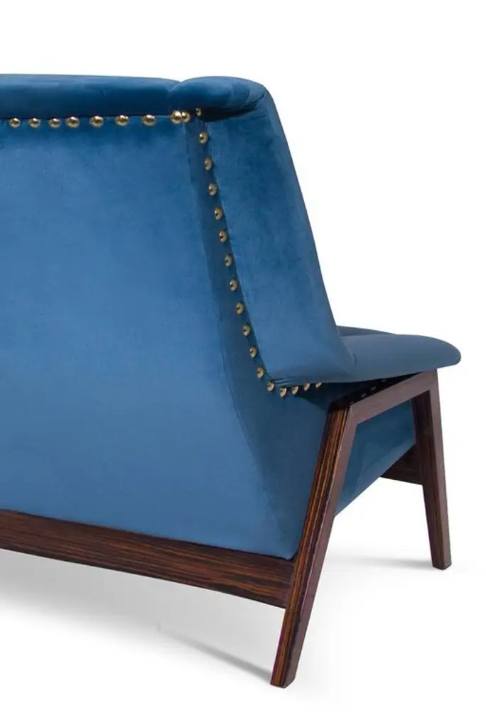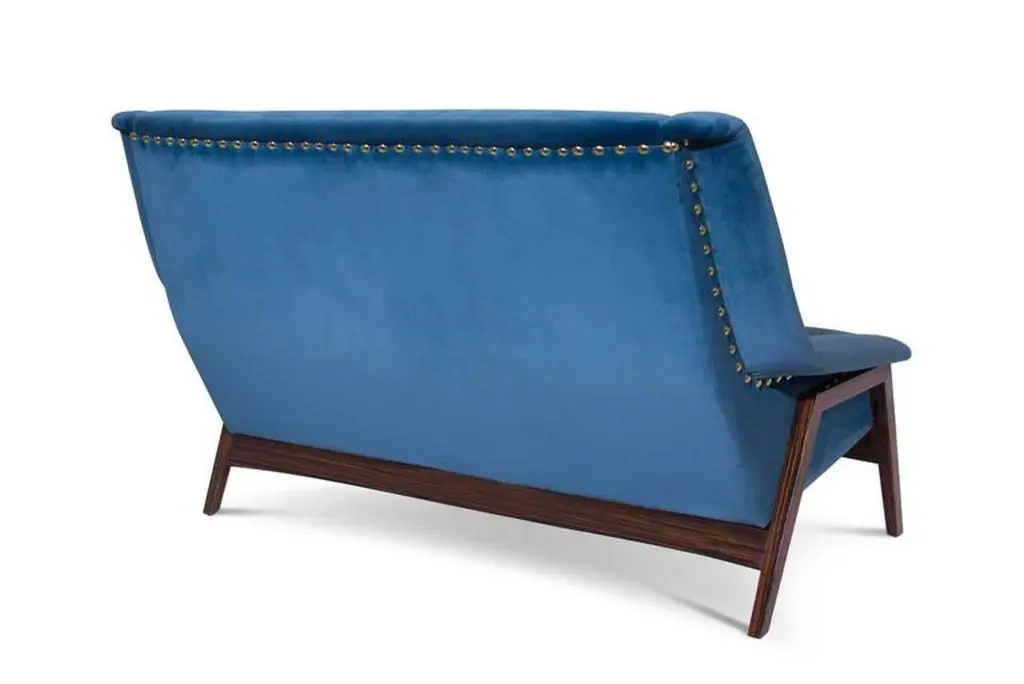 Sofa Prima two seater in blue cotton velvet fabric andebony wood veneer structure with glossy varnishand polished gold nails. Also available in Prima armchair and with other fabrics finish on request.