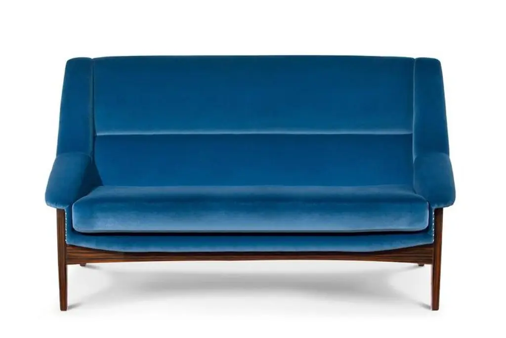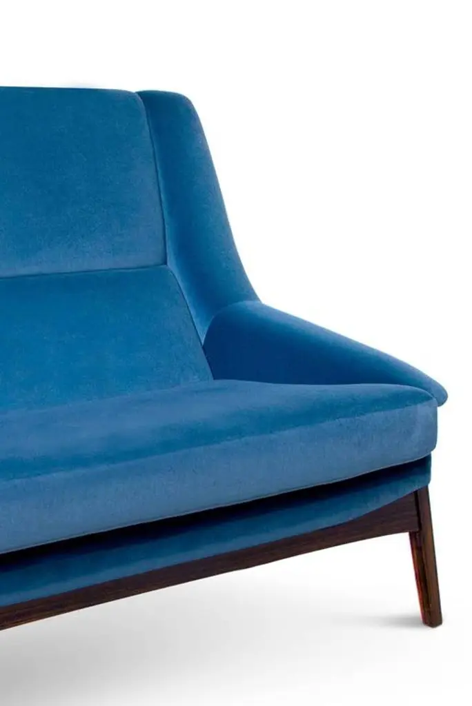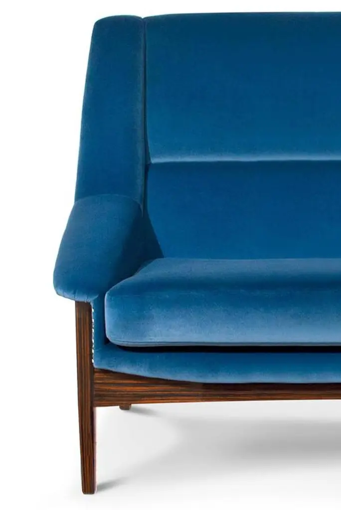 Prima Sofa Two Seater In Blue Cotton Velvet And Ebony Wood Veneer