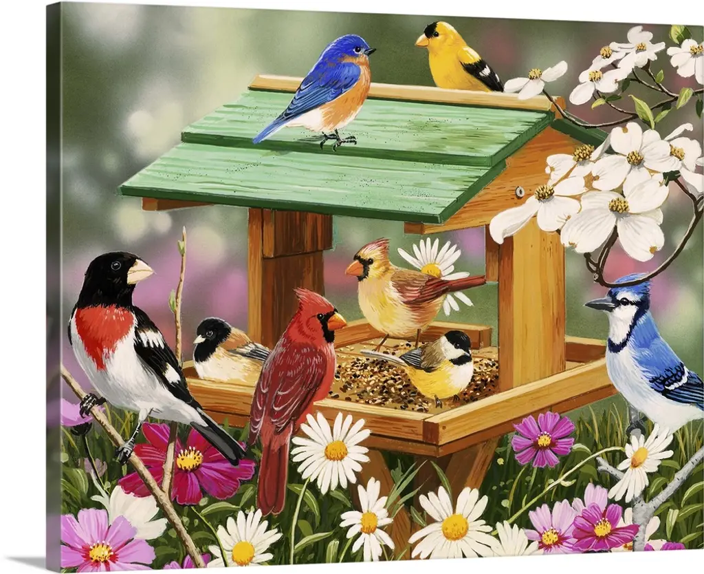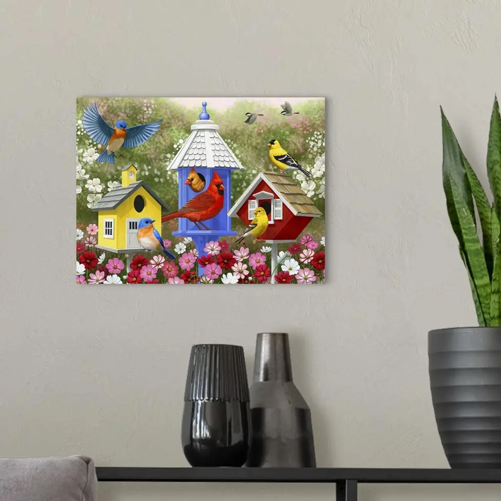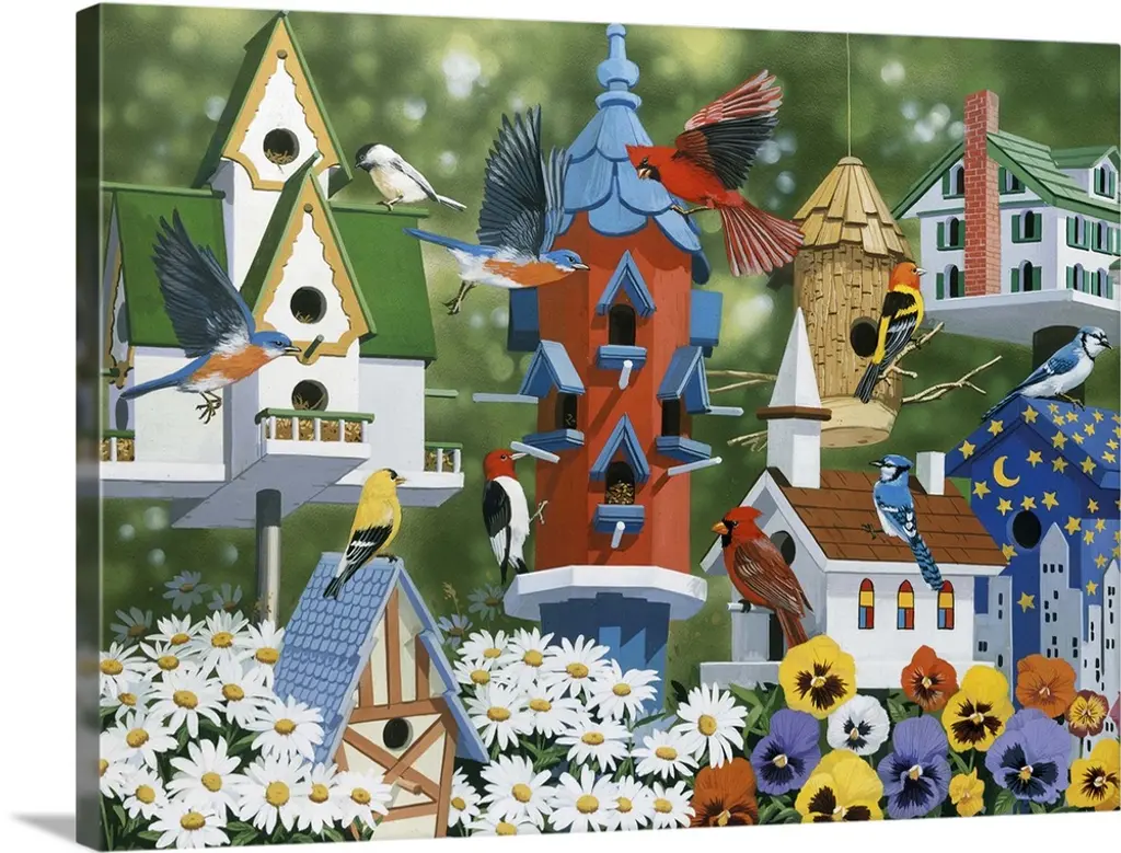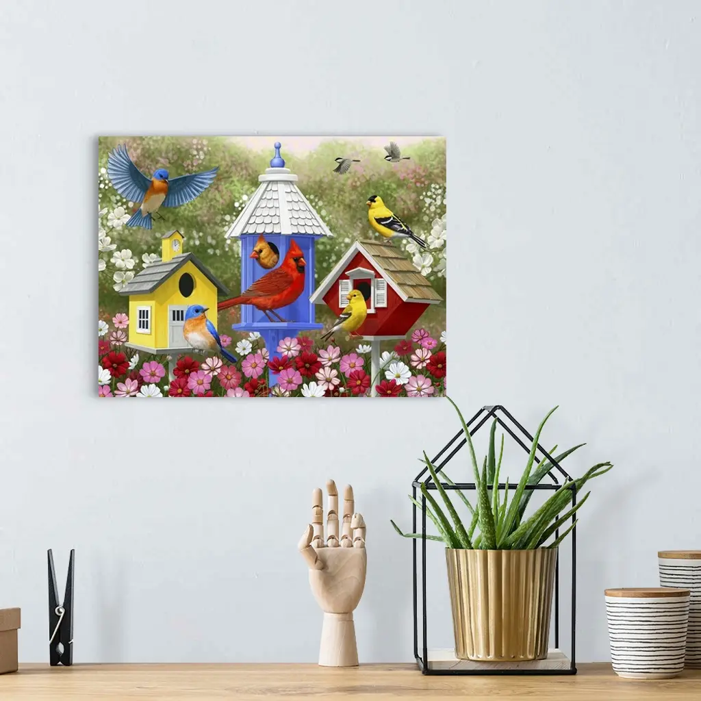 Several songbirds including cardinals, bluebirds, and goldfinches visiting birdhouses.