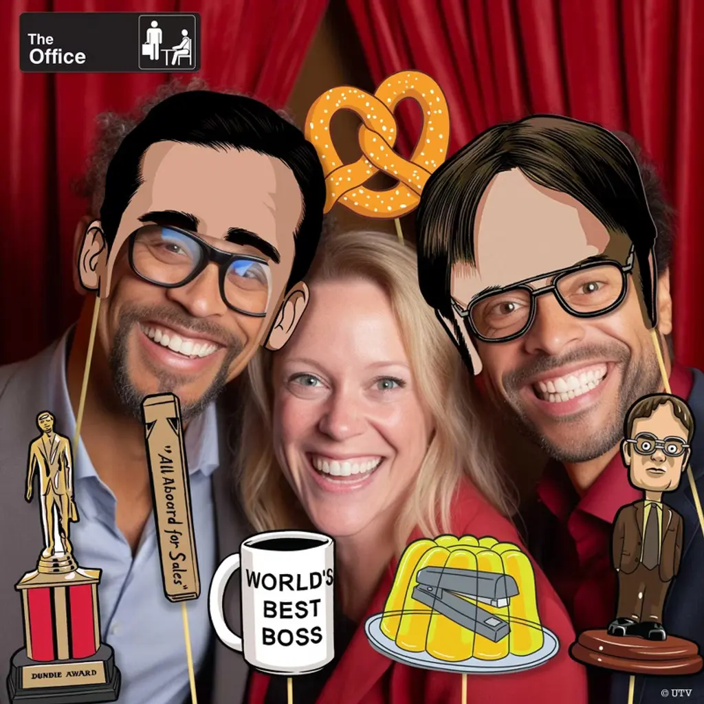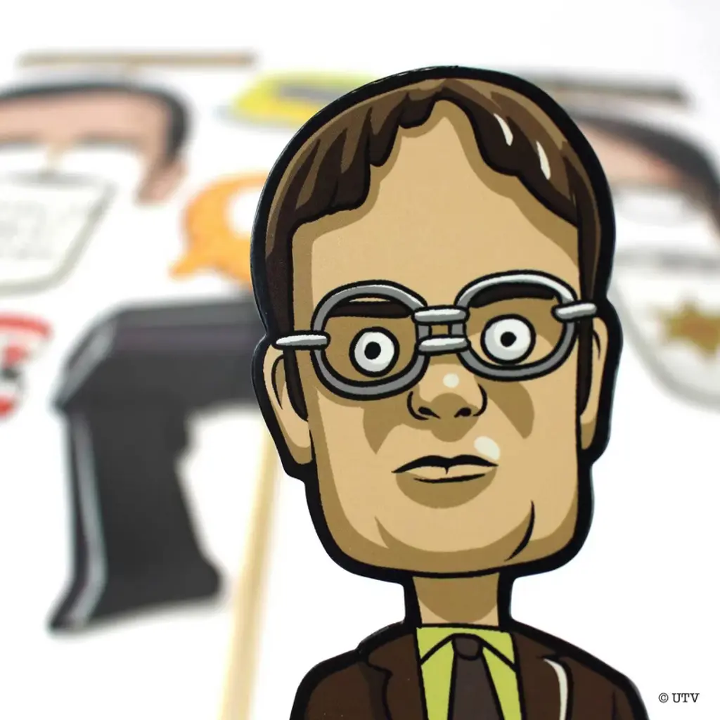 Step into the quirky world of Dunder Mifflin with "The Office" Themed Photo Booth Props - your ticket to capturing hilarious and memorable moments! This set includes 12 paper photo props that pay homage to the iconic characters and moments from the show, along with 12 tape circles and 12 sturdy wood sticks measuring 11.5" long for easy holding. Dive into the chaos of the Scranton branch as you channel your inner Michael Scott with his signature forehead, "World's Best Boss" Coffee Mug, chattering teeth, "All Aboard for Sales" train whistle, and his trusty megaphone. Your best friend can join in on the fun by becoming Dwight Schrute with his forehead and glasses, Bobblehead, sheriff coffee mug, and his name plaque. And, of course, don't forget to recreate the unforgettable Dundee award, the infamous stapler suspended in jello prank, and the iconic pretzel photo prop! With these props and our included instructions, you'll be ready to create a photo booth experience that even Jim Halpert would approve of. Whether it's a themed party, office event, or just a casual get-together, our "The Office" Themed Photo Booth Props will have everyone saying, "That's what she said!" Capture the essence of this beloved show one hilarious snapshot at a time!