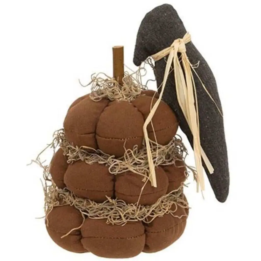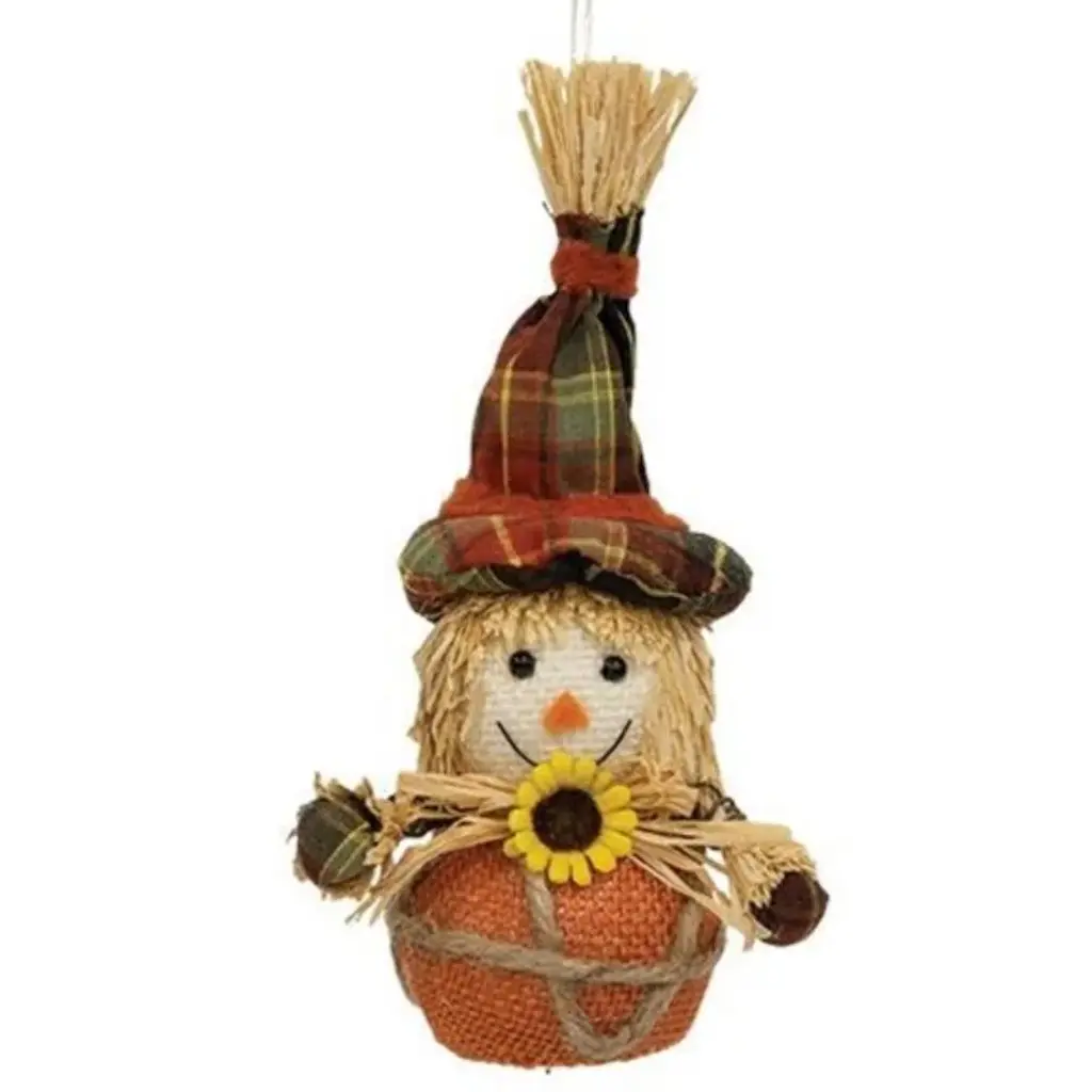 Specifications:Description:The Primitive Scarecrow Hanger is a decorative plush scarecrow head ornament made of antiquated ivory linen-style fabric. The scarecrow has a stitched face, raffia hair, and features a burlap hat with pin. The top of the ornament includes a jute string hanger to use for display, wonderful for bringing a festive, rustic touch to a tree, knob, or hook in the home during the Halloween season.