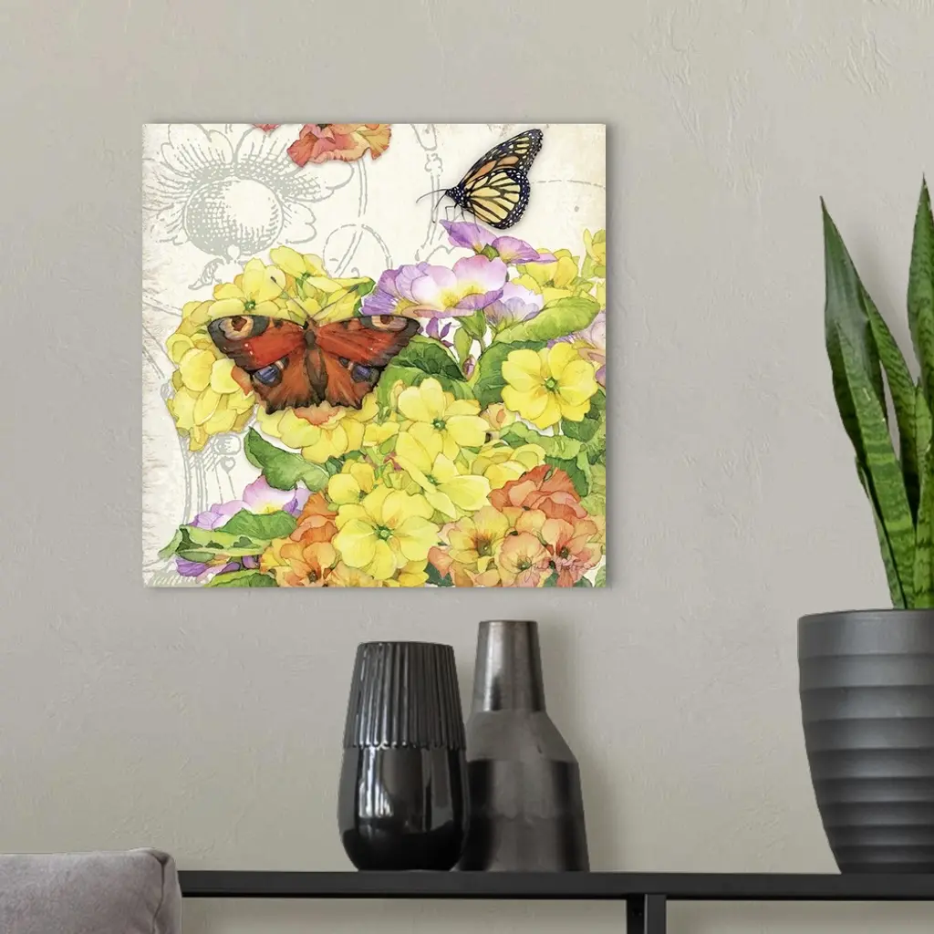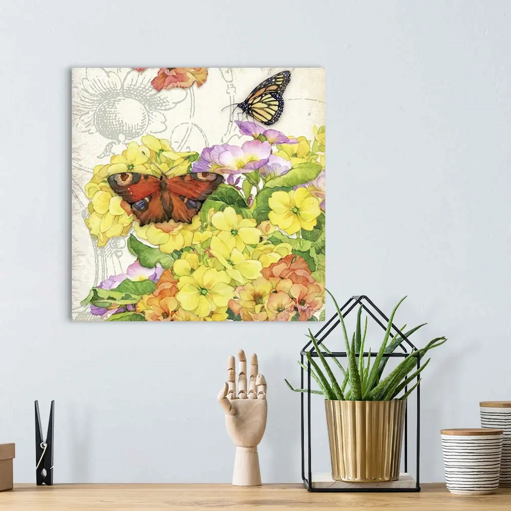 Square decor with watercolor painted yellow, purple, and orange primrose flowers and two butterflies on a neutral colored background with light gray floral illustrations.