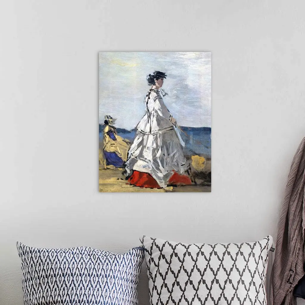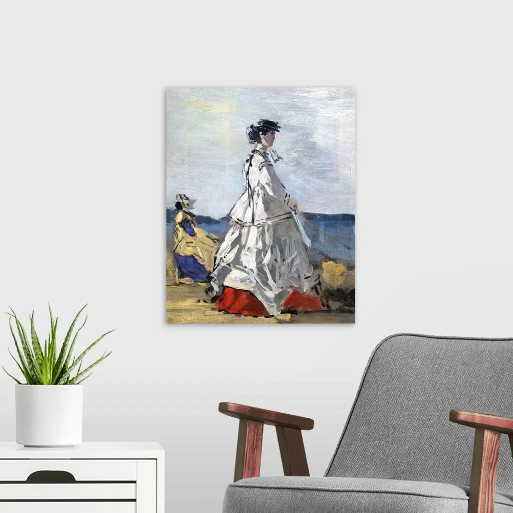 Pauline Metternich, wife of the Austrian ambassador at the court of Napoleon III, was a famously homely yet chic style icon known for her sense of wit; she was said to have referred to herself as the fashion monkey. Boudin achieved success with his scenes of stylishly dressed families taking the sea air at Trouville and other beach resorts, and apart from Empress Eugenie, no woman would have aroused more interest on the beach than her friend Princess Metternich.