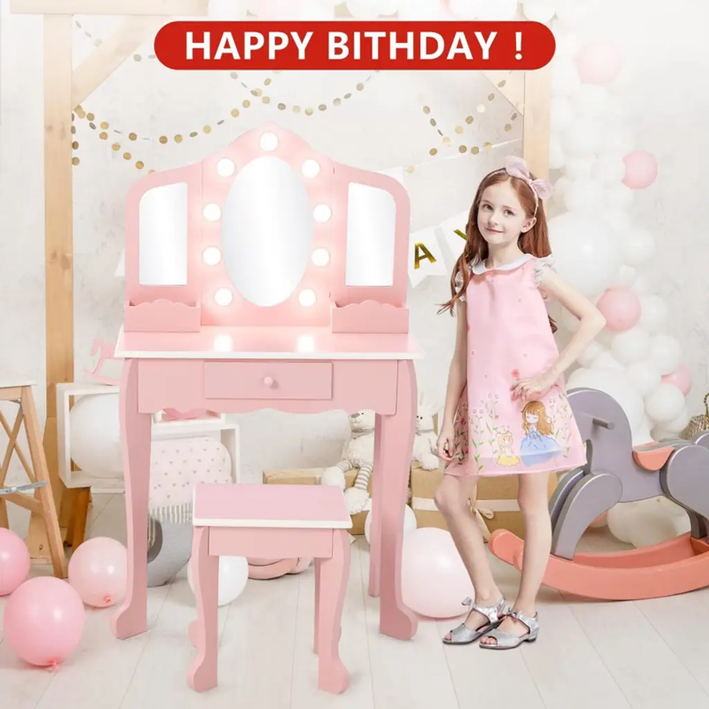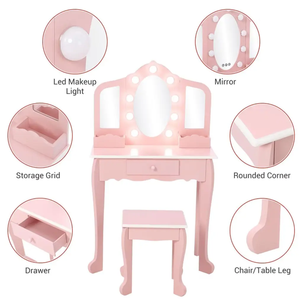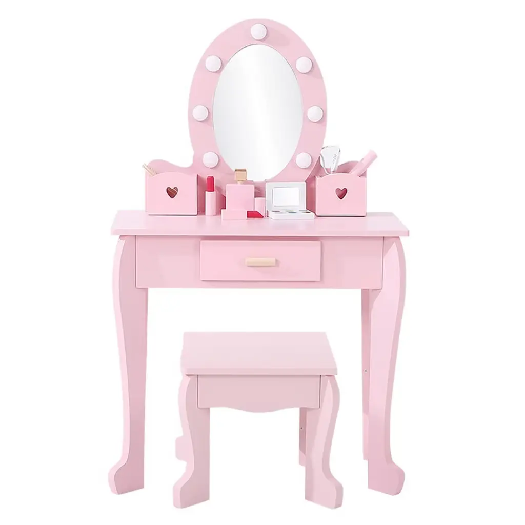 Princess Wooden Vanity Set With Light & Mirror - Girls Makeup Desk With Drawer, Pretend Play Dressing Table & Chair (Batteries Not Included Pink)