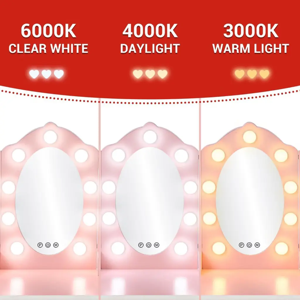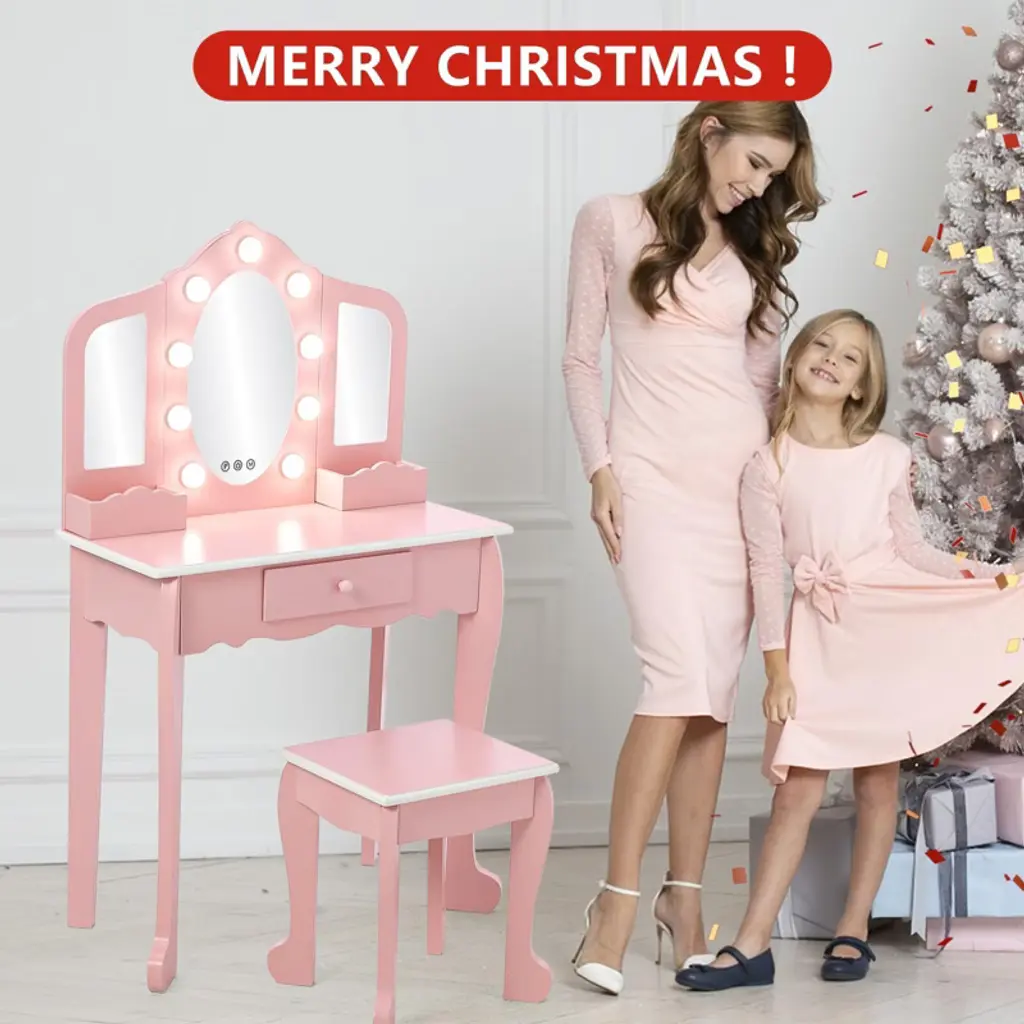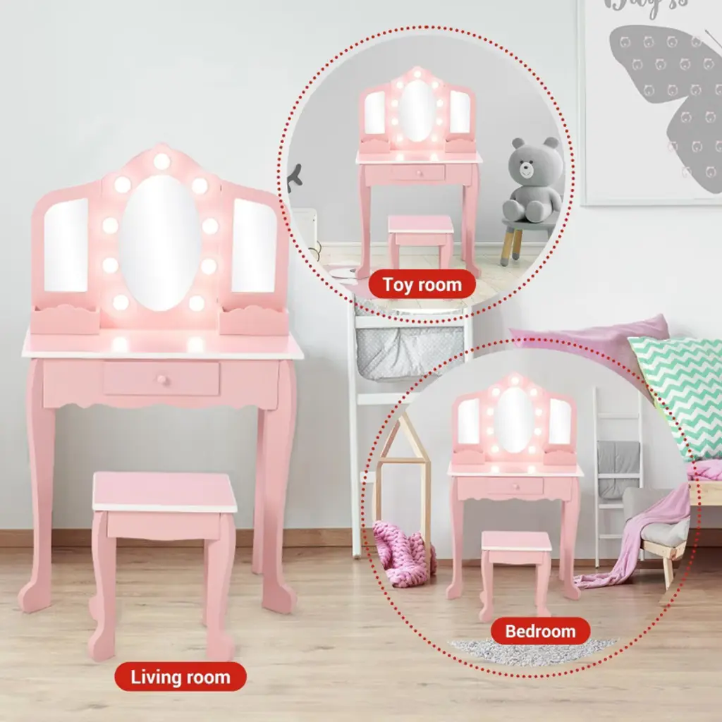 Princess Wooden Vanity Set With Light & Mirror - Girls Makeup Desk With Drawer, Pretend Play Dressing Table & Chair (Batteries Not Included Pink)