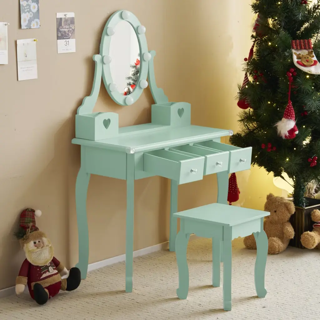 The girls' vanity set measures 37"(H) X 23.2"(L) X 11"(W), while the stool is 12" (H) X 11.4" (L) X 9.4" (W), perfect for 4-9 yr princesses.