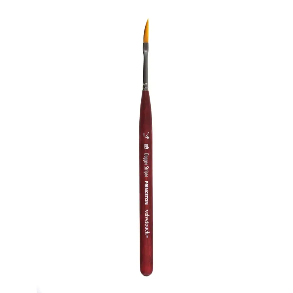These short handle mixed media synthetic brushes work well with oil, acrylic or watercolor paint. The luxe-blend multiple-filament blend offers excellent color holding capacity. Each individual brush has precision tapering for fine point and spring, a nickel-plated brass ferrule and the signature Velvetouch handle for ultimate comfort.