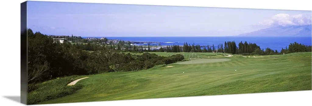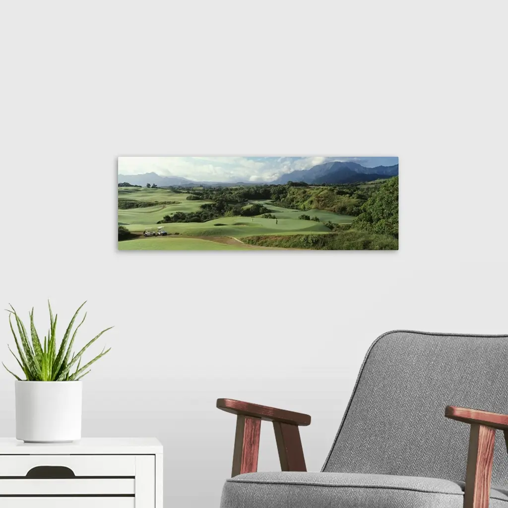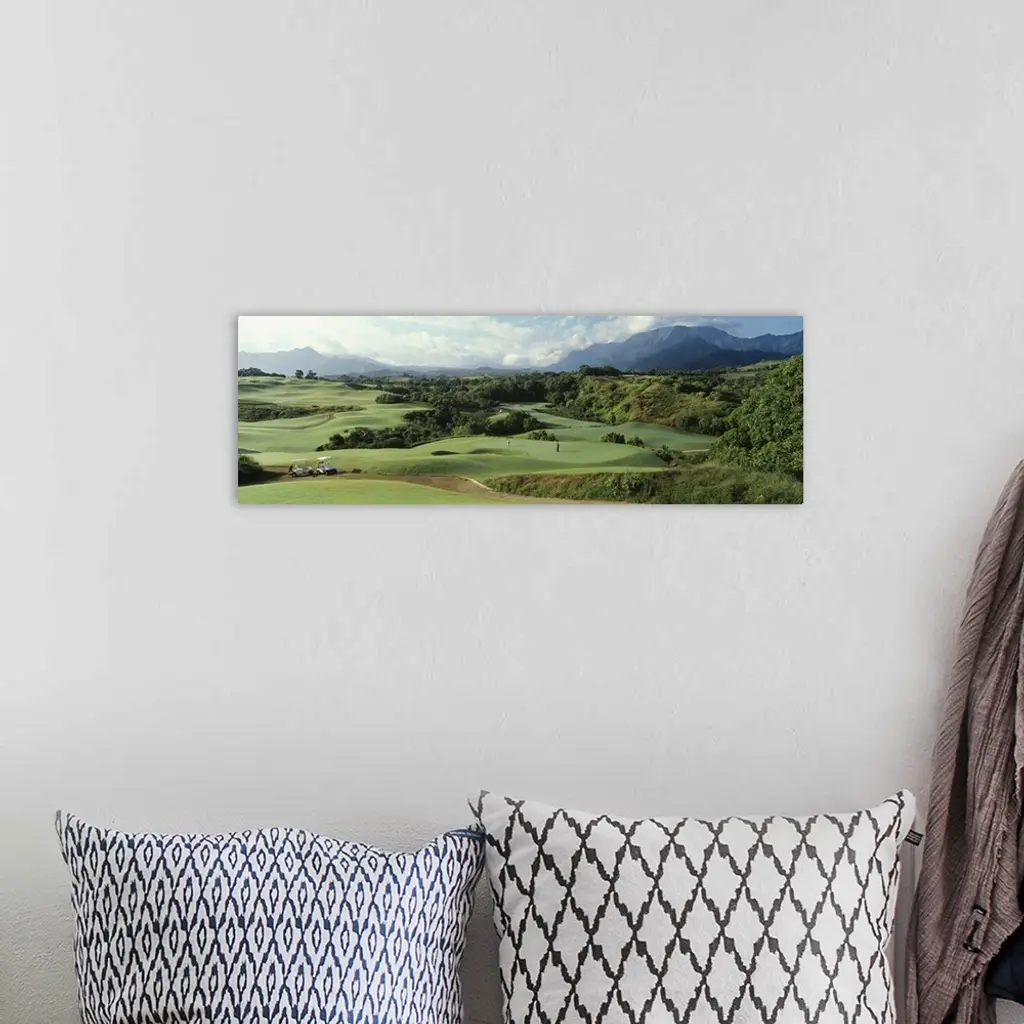 Panoramic picture of rolling hills of a golf course nestled in the Hawaiian mountains.