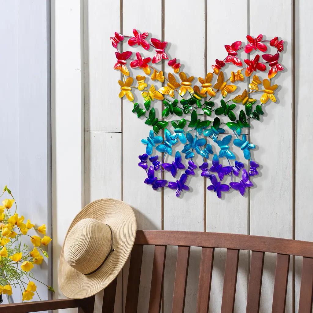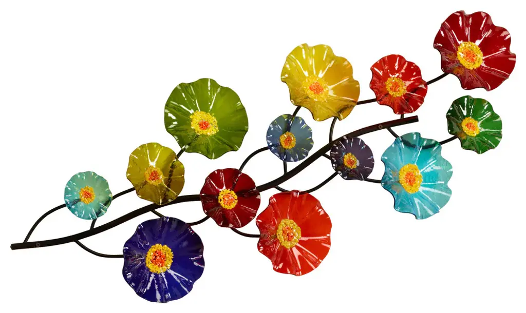 Vibrant, kiln-formed glass flowers bloom across the wall in a joyful, rainbow-hued bouquet. Each flower is carefully attached to a hand-sculpted aluminum vine. Each piece is unique; exact colors and arrangement may vary.