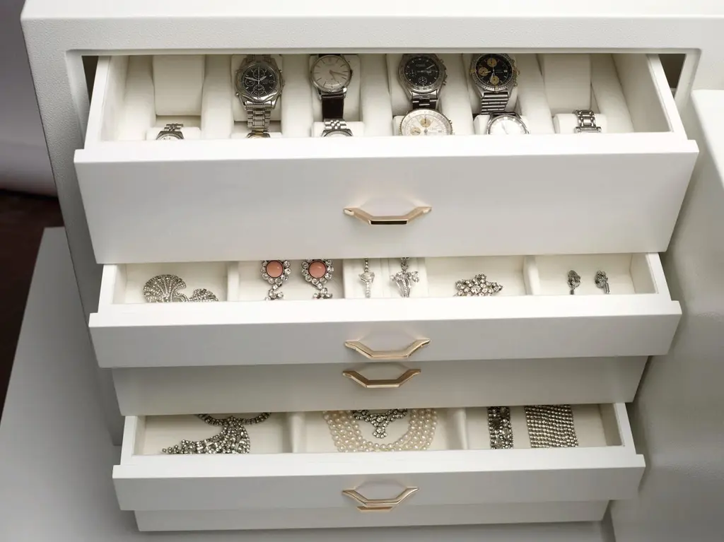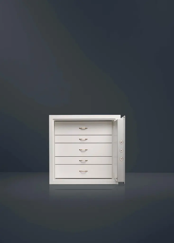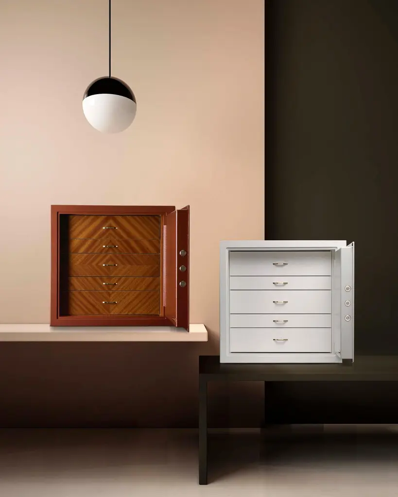 Safe for jewelry, available in three finishing options. See information below for details of finishing variations. Copper: Jewelry case in hammered copper finish steel. Drawers in mahogany lined for jewelry and watches. Opening with numeric device covered in leather. White Steel: Jewelry case in hammered white steel. Drawers in white birds eye maple lined for jewelry and watches. Opening with numeric device covered in leather. Black Steel: Jewelry case in hammered black steel. Drawers in matte finish ebony lined for jewelry and watches. Opening with numeric device covered in leather."