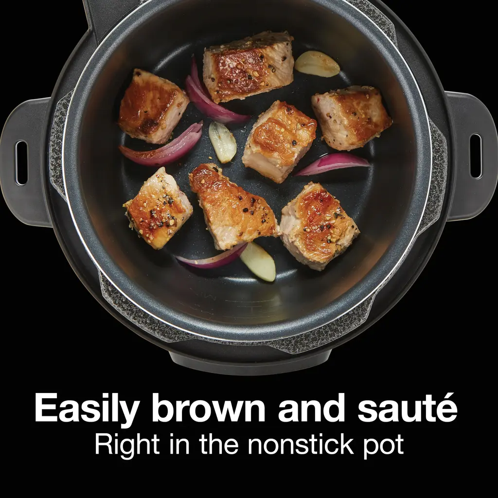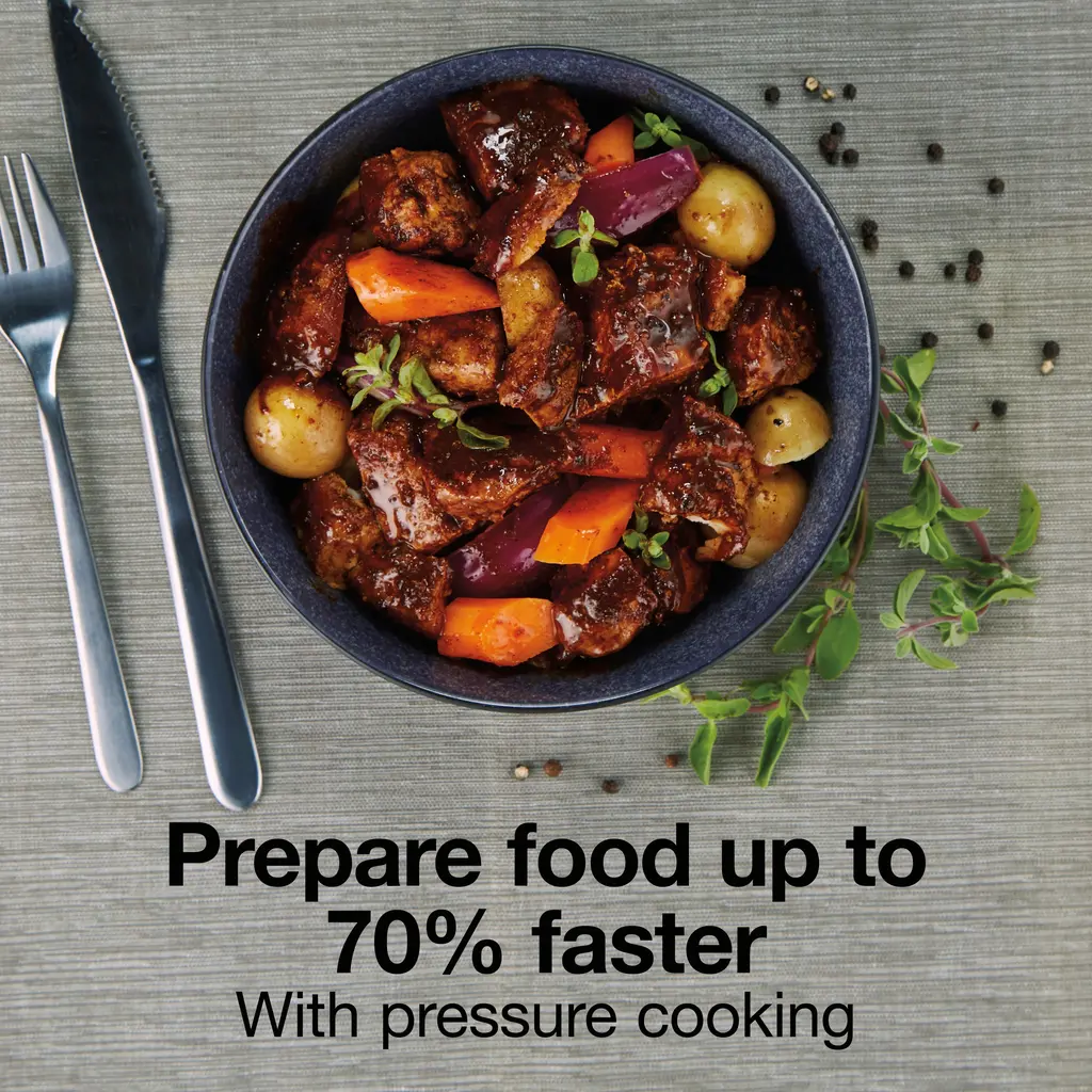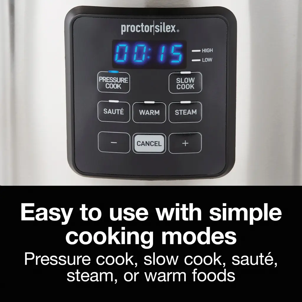 The Proctor Silex® 3 Quart Simplicity™ Pressure Cooker is the perfect size for cooking meals for 3+ people. It's smaller than typical pressure cookers and has simple cooking modes. Easily follow your favorite recipes. Just pick your cooking mode and set the timer. There's nothing complicated to figure out and no pre-programmed settings to decipher, yet you still have a variety of cooking options to choose from. Pressure cook, slow cook on high or low, sauté, steam, or warm foods in this one easy-to-use multi-cooker. Choose pressure cooking when you need to get dinner on the table fast. Pressure cooking prepares food up to 70% faster. Or choose slow cooking to cook foods longer at lower temperatures. True Slow™ technology raises the temperature gradually for classic slow cooking results without overcooking. The brown/sauté button lets you add more flavor to meals by browning and sautéing foods in the nonstick pot before cooking. The pressure cooker includes a lift-out roasting/steaming rack for meats or vegetables. The roasting rack, nonstick pot and condensation cup are dishwasher safe for easy cleanup. The countdown timer on the digital display helps you easily keep track of cooking time and beeps when food is ready.