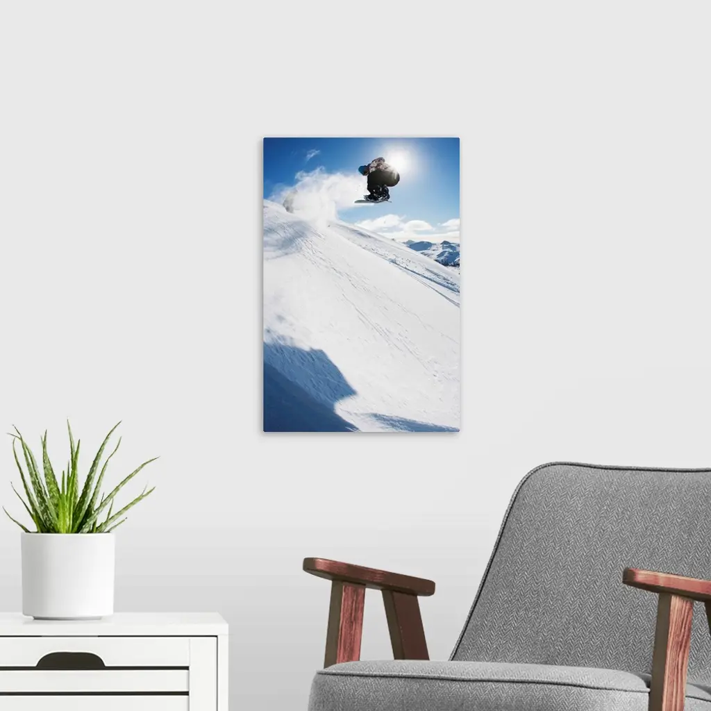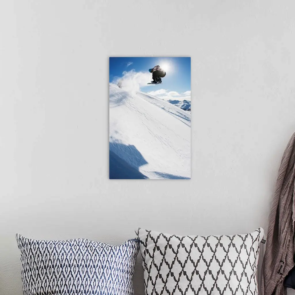 Professional snowboarder making a jump in fresh snow near Ushuaia, Patagonia, Argentina wall art for home and office decor. Discover canvas art prints, photos, mural, big canvas art and framed wall art in GreatBigCanvas.com's varied collections.