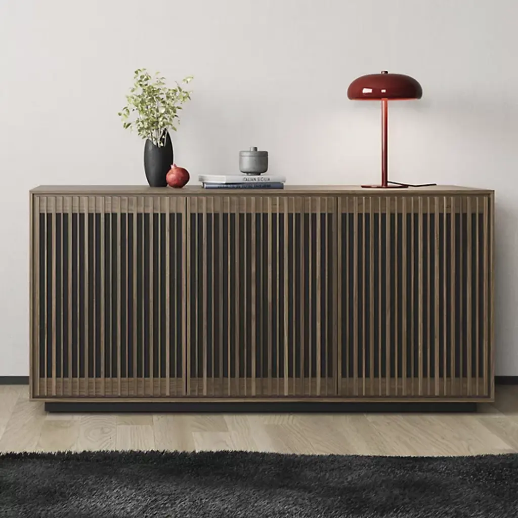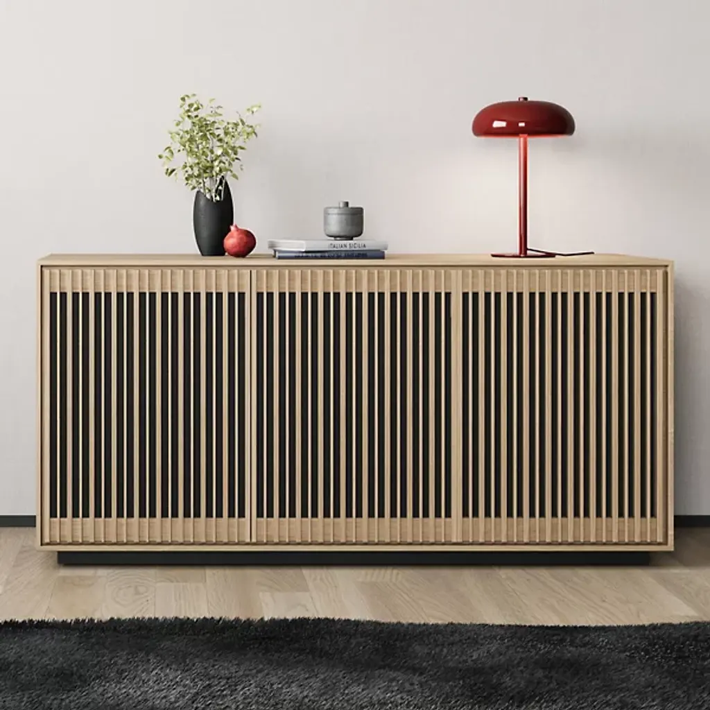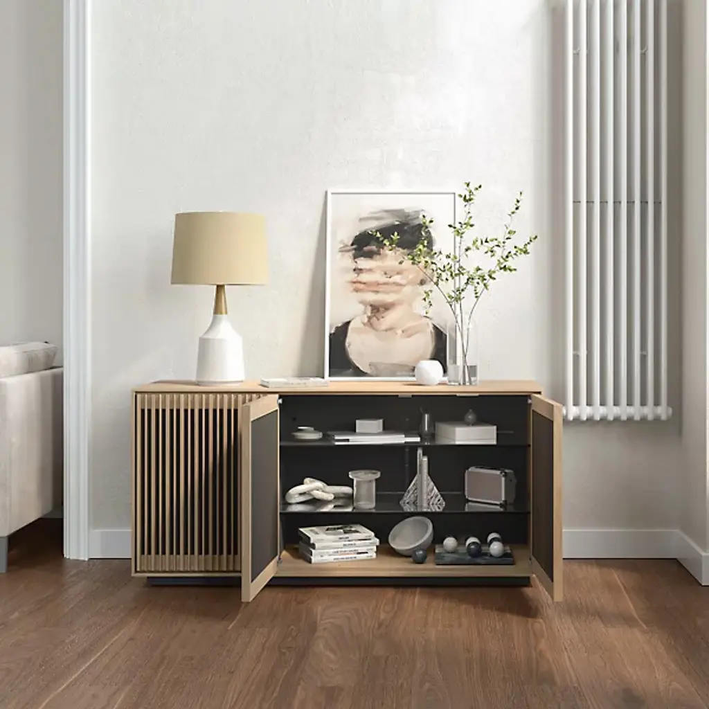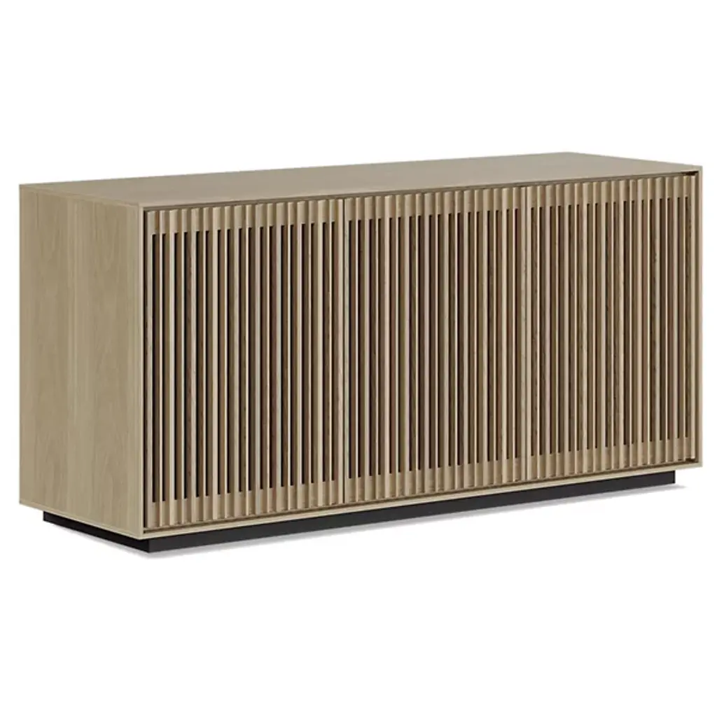Bring home a piece of modern craftsmanship with the BDI Profile 3-Door Media Storage Console. Styled with a contemporary flair, this console exhibits a beautiful blend of natural hardwood, MDF, and tempered glass. The Profile console features flexible tempered glass shelving, perfect for accommodating AV components, personal items, and more. Plus, its intricate design includes oak hardwood slatted doors that not only hide contents elegantly but also allow for ventilation and remote control accessibility. It's a versatile addition to your living room, bedroom, or office space.