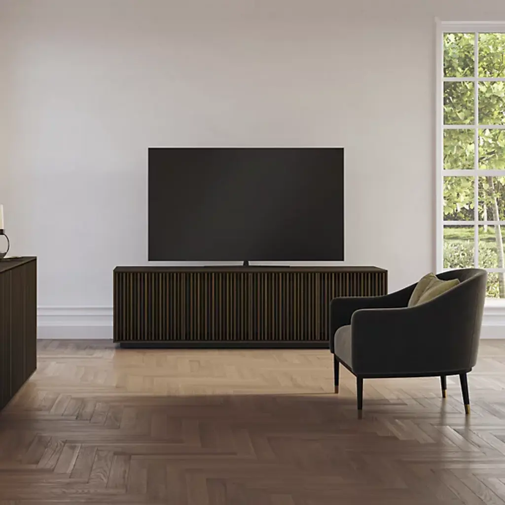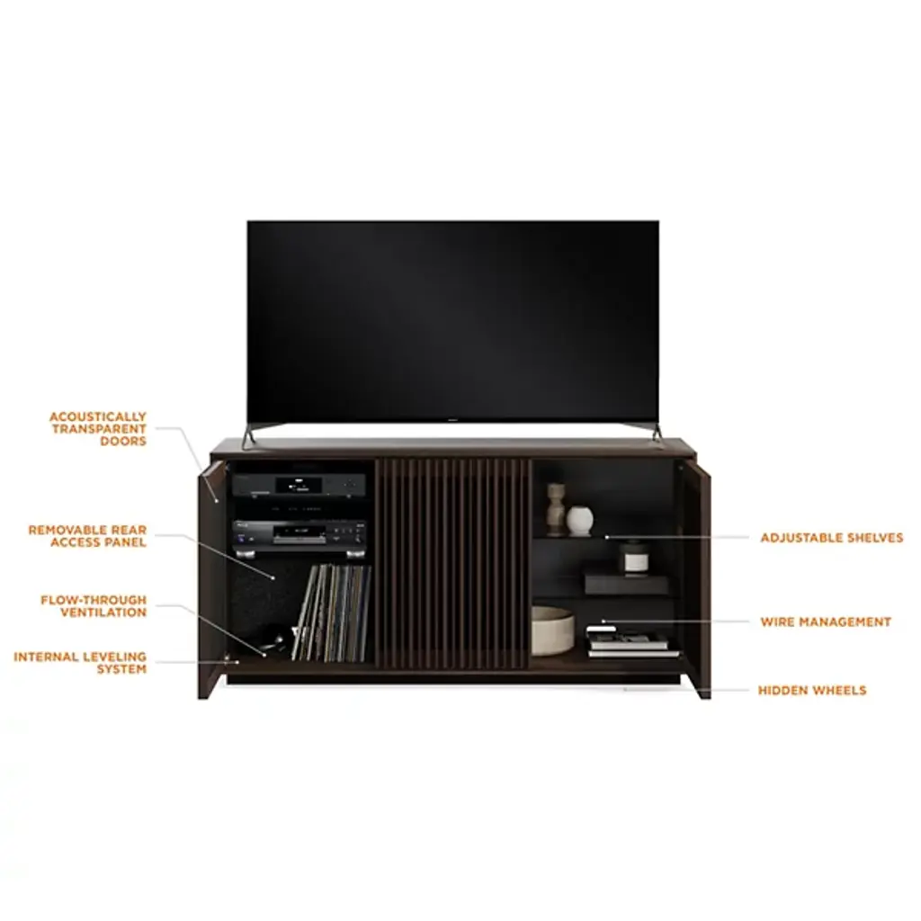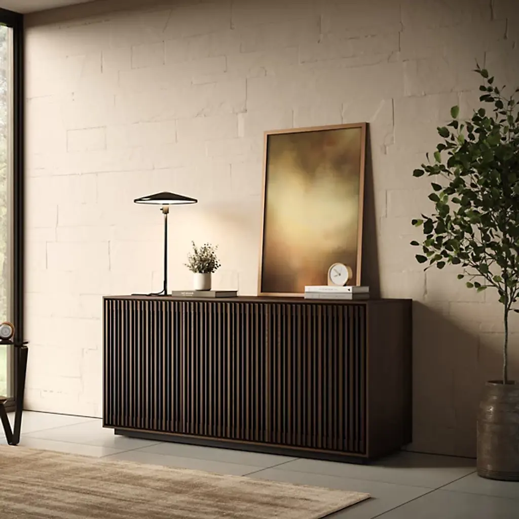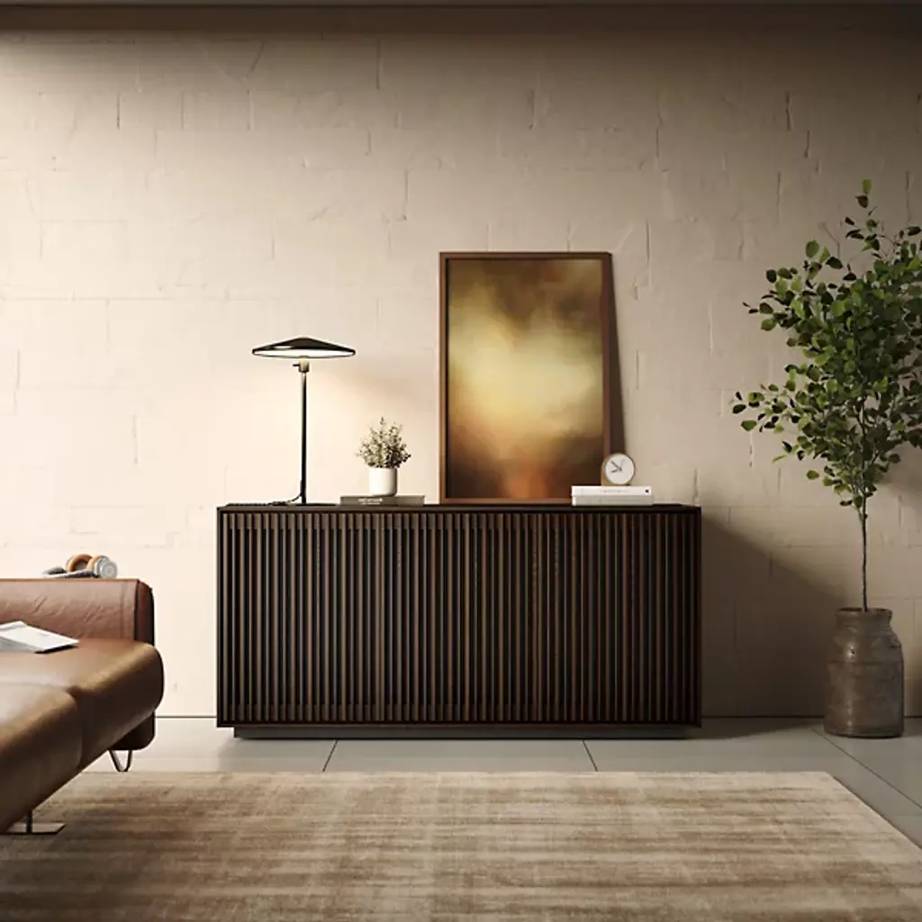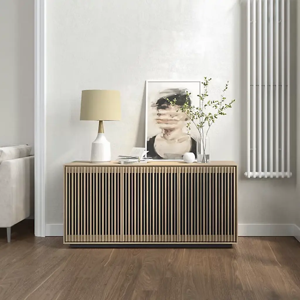 Bring home a piece of modern craftsmanship with the BDI Profile 3-Door Media Storage Console. Styled with a contemporary flair, this console exhibits a beautiful blend of natural hardwood, MDF, and tempered glass. The Profile console features flexible tempered glass shelving, perfect for accommodating AV components, personal items, and more. Plus, its intricate design includes oak hardwood slatted doors that not only hide contents elegantly but also allow for ventilation and remote control accessibility. It's a versatile addition to your living room, bedroom, or office space.