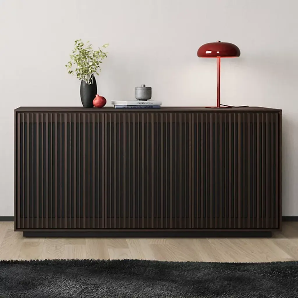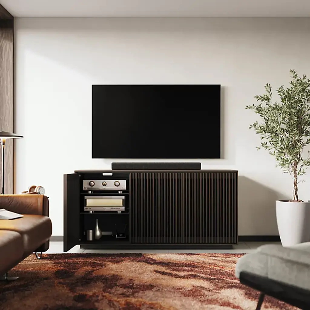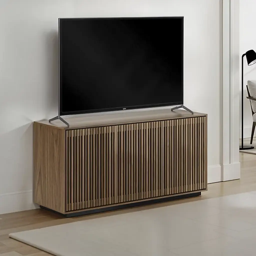 Bring home a piece of modern craftsmanship with the BDI Profile 3-Door Media Storage Console. Styled with a contemporary flair, this console exhibits a beautiful blend of natural hardwood, MDF, and tempered glass. The Profile console features flexible tempered glass shelving, perfect for accommodating AV components, personal items, and more. Plus, its intricate design includes oak hardwood slatted doors that not only hide contents elegantly but also allow for ventilation and remote control accessibility. It's a versatile addition to your living room, bedroom, or office space.