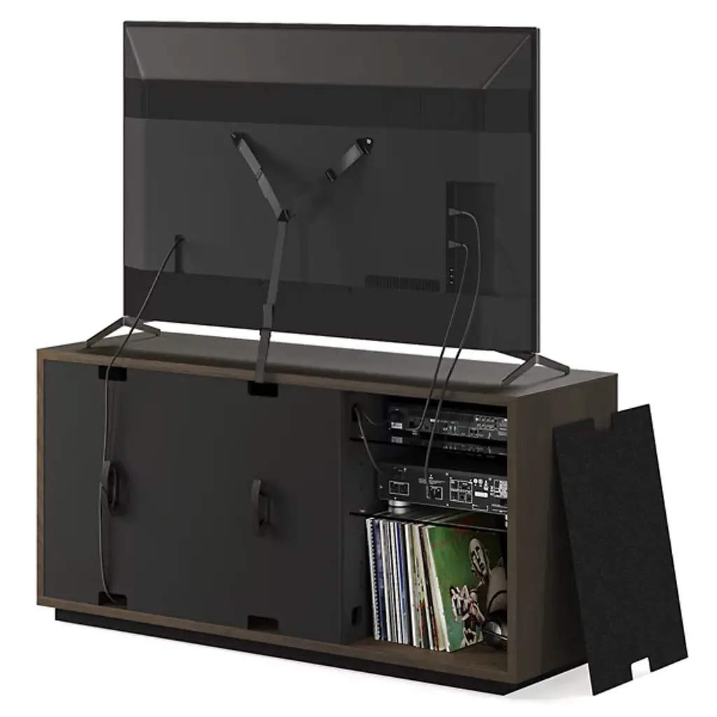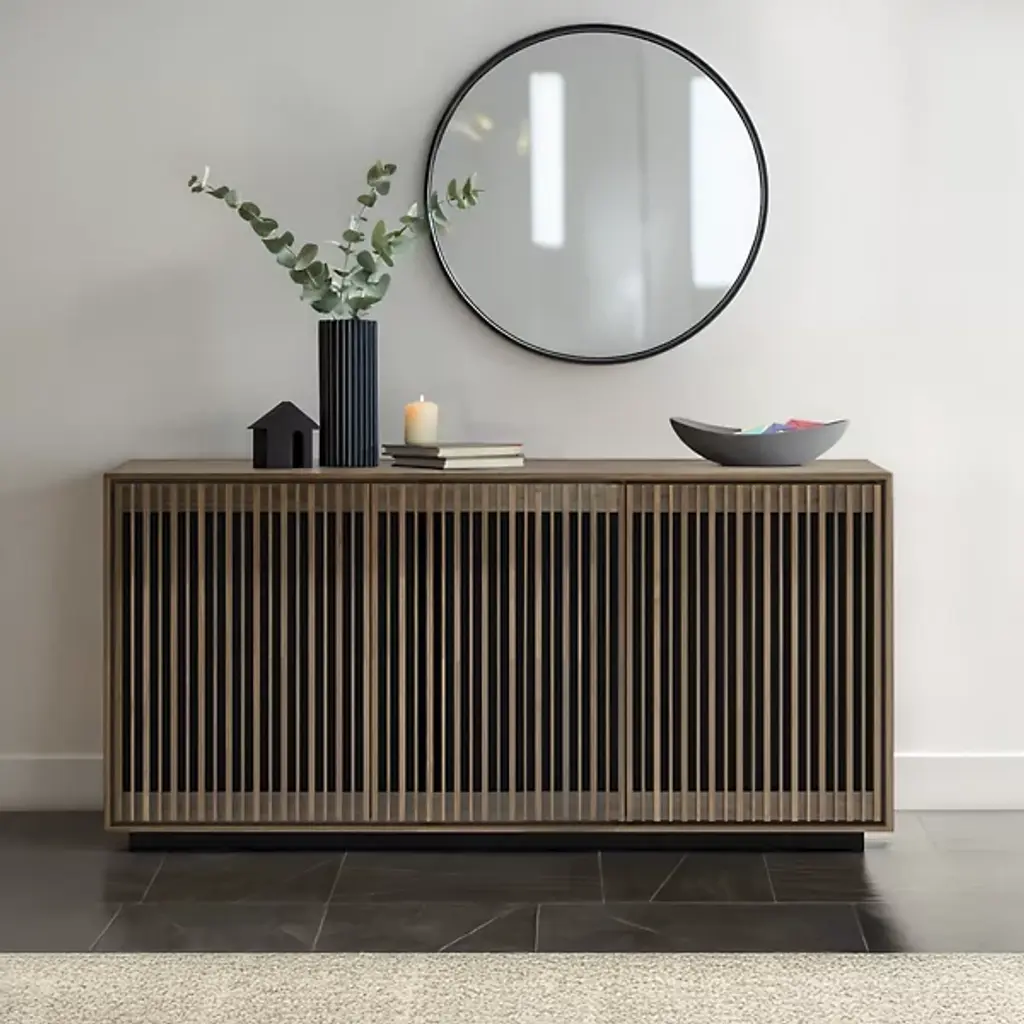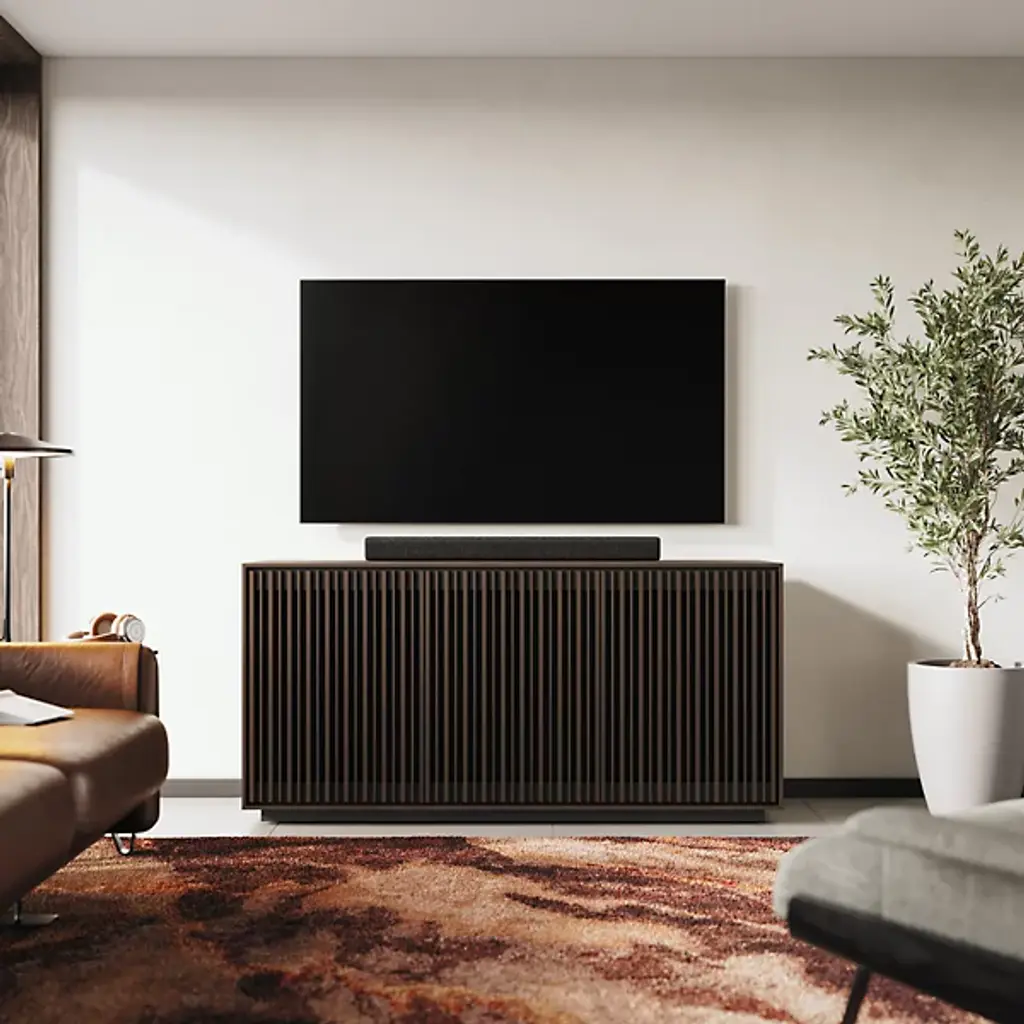 Bring home a piece of modern craftsmanship with the BDI Profile 3-Door Media Storage Console. Styled with a contemporary flair, this console exhibits a beautiful blend of natural hardwood, MDF, and tempered glass. The Profile console features flexible tempered glass shelving, perfect for accommodating AV components, personal items, and more. Plus, its intricate design includes oak hardwood slatted doors that not only hide contents elegantly but also allow for ventilation and remote control accessibility. It's a versatile addition to your living room, bedroom, or office space.