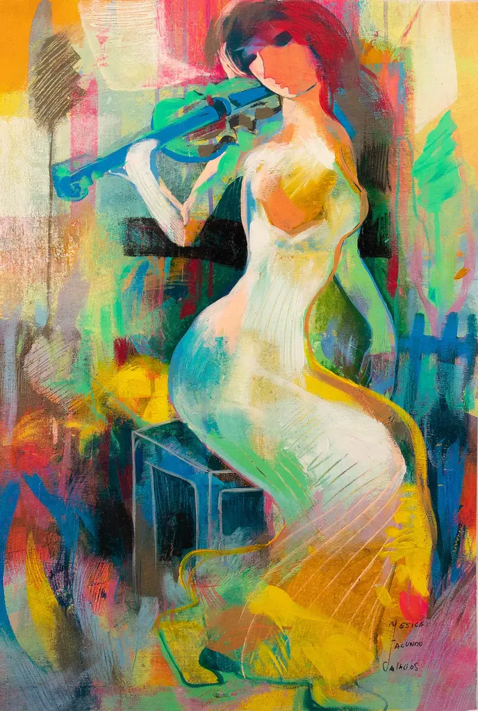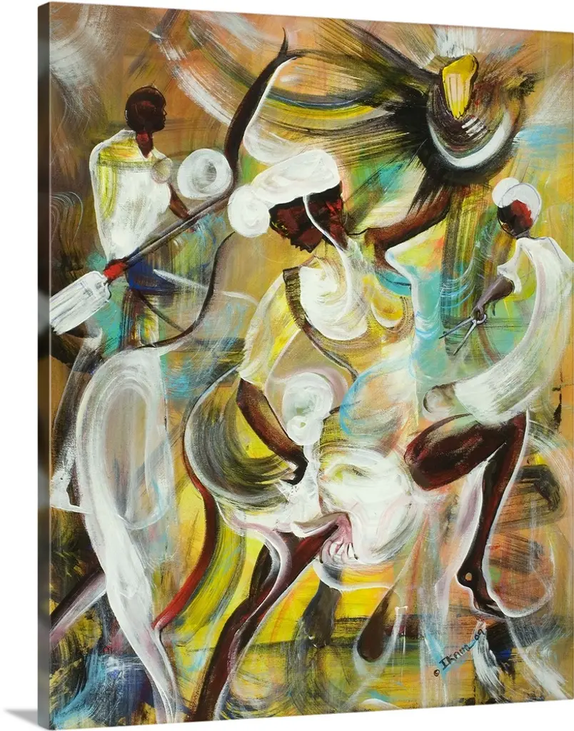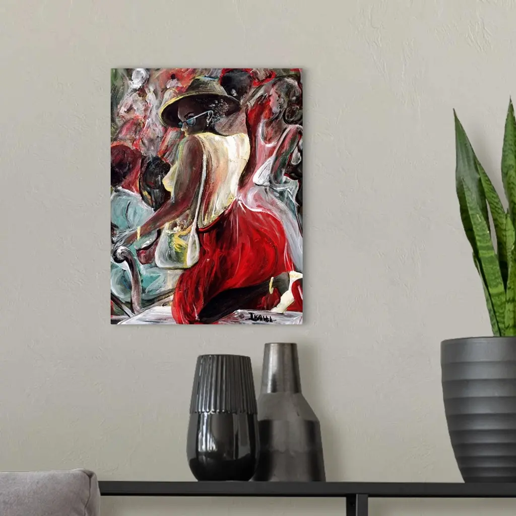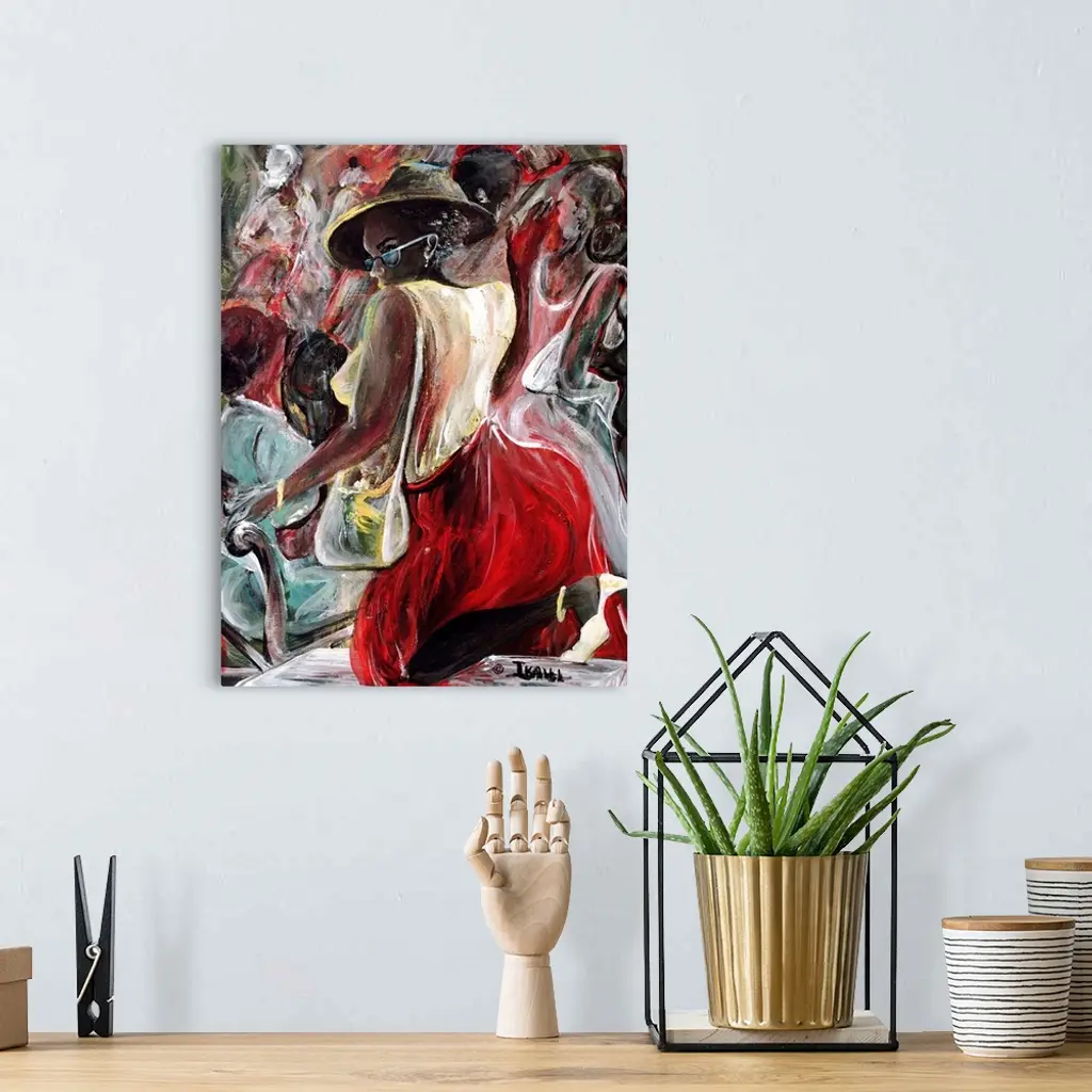 Modern art depicting a well-dressed woman with a hat, glasses, purse, and high heels looking off into the distance with people around her blended into the abstract, muffled background.