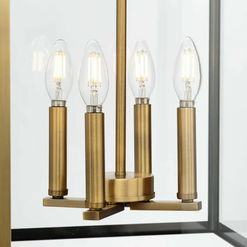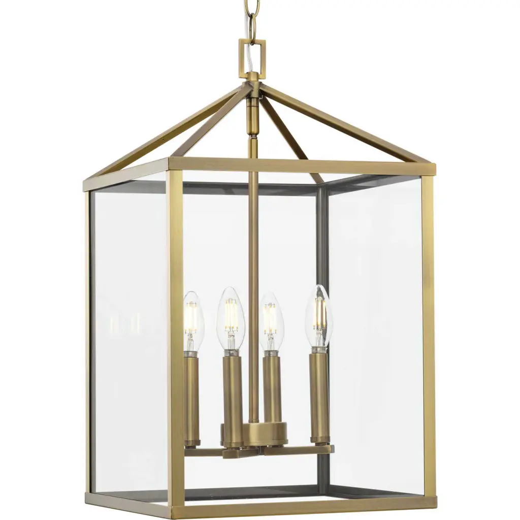 Introducing the Hillcrest Foyer Light from Progress Lighting. Crafted from durable steel with a vintage brass finish, this stunning fixture boasts a width of 13" and a height of 22". The classic candelabra base is encased within clear beveled glass panels, casting a clear illumination. Ideal for Transitional and Modern Farmhouse settings, this light is perfect for halls, foyers, and kitchens. It measures 13" in length and comes with 48" of chain, suitable for various ceiling heights and sloped ceilings. With a dry rating, it's perfect for indoor use. This fixture accommodates four 60-watt incandescent bulbs or LED equivalents (sold separately) and is dimmable for customizable lighting. Backed by a 1-Year Limited Warranty, it includes installation instructions and mounting hardware for easy setup. Elevate your space with the timeless elegance of the Hillcrest Foyer Light.
