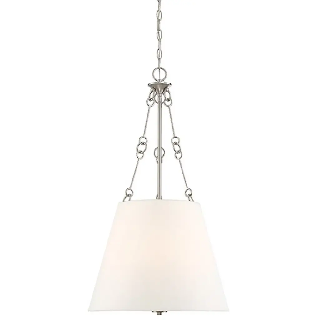 Introducing the Progress Lighting Inspire Collection! Embrace timeless elegance with this large foyer fixture, crafted from durable steel with a sleek Brushed Nickel finish. The flowing lines and waving metal arms exude a classic charm, while the off-white linen shade adds a touch of sophistication. With a width of 14.75" and a height of 20.25", this fixture is perfect for creating a welcoming ambiance in any space. The included 72" chain allows for customizable installation, and the dry rating ensures versatility. Illuminate your home with the warm glow of the included 100-watt incandescent bulb. Elevate your decor with the Inspire Collection's graceful and traditional design.