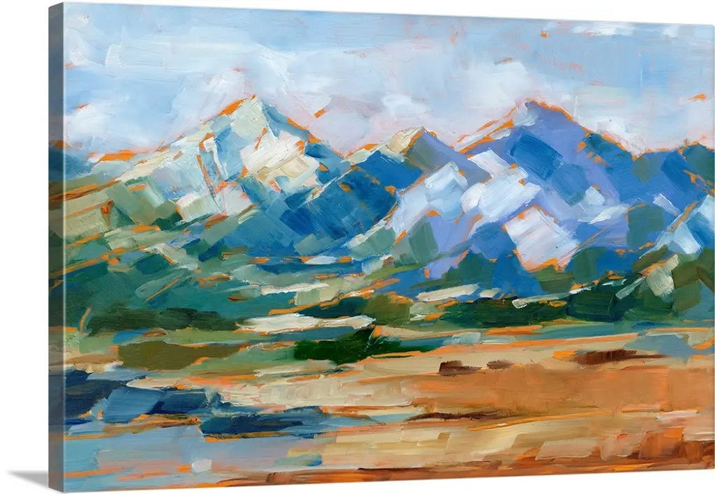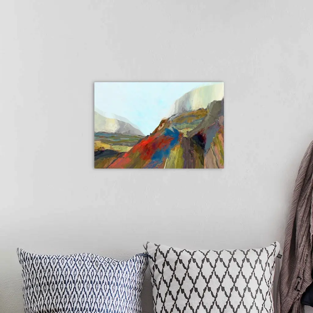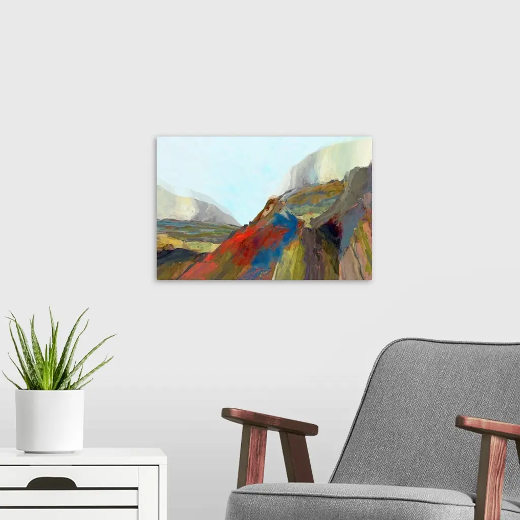 Colorful large abstract art with transparent-like hues resembling mountains and sky.