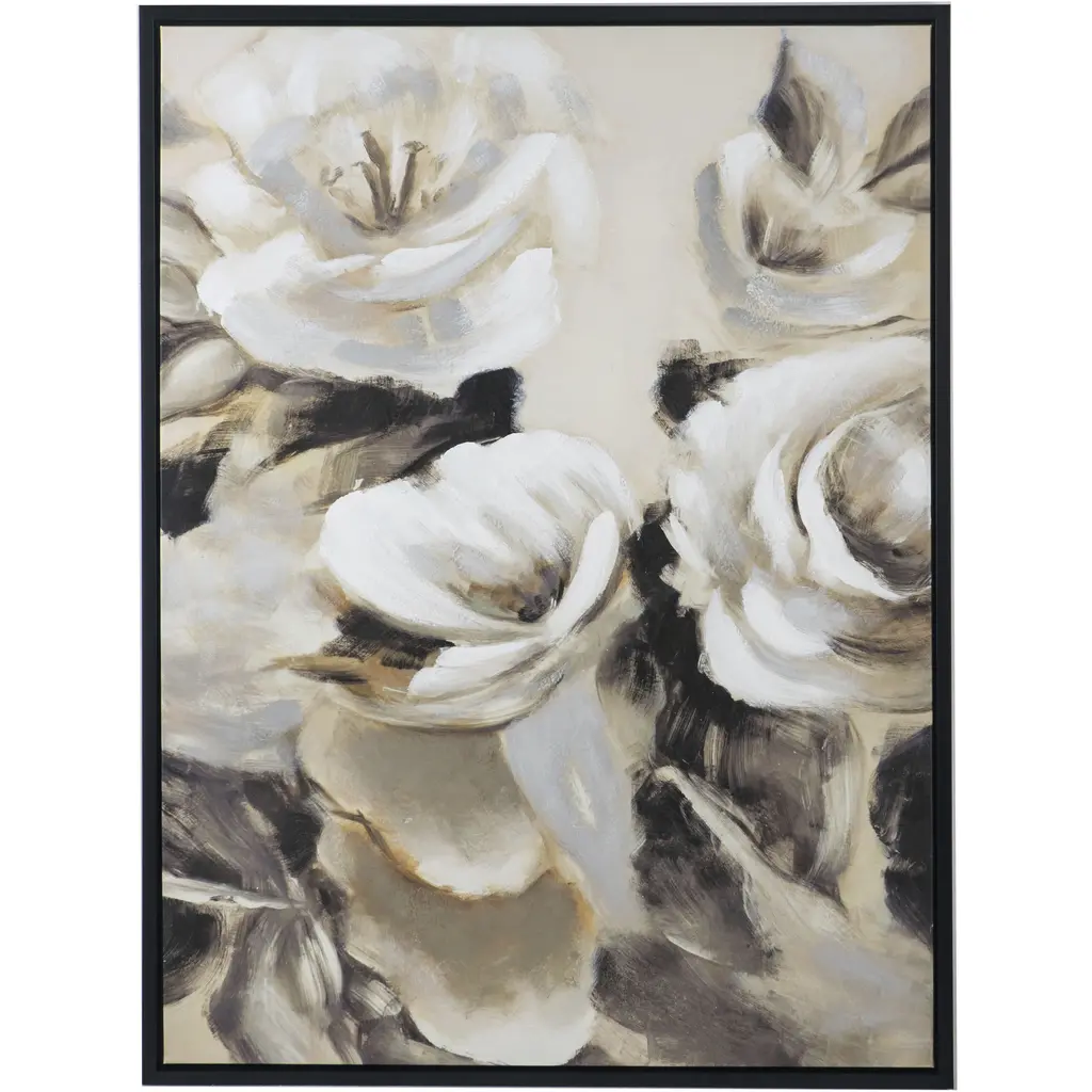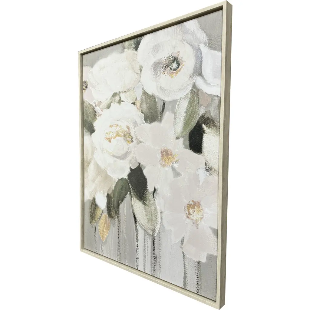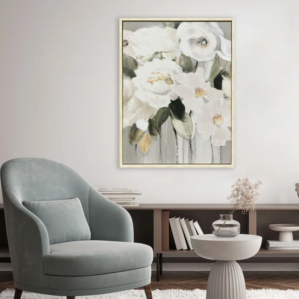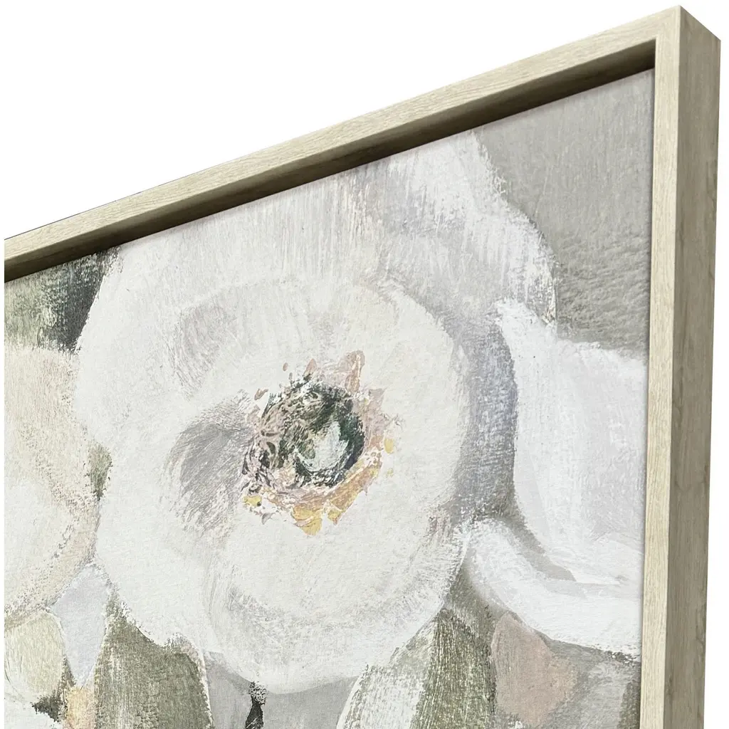 A lavish bouquet of white floral blossoms adds a modern flair to today's traditional interiors. The canvas is mounted in a whitewash floater frame.