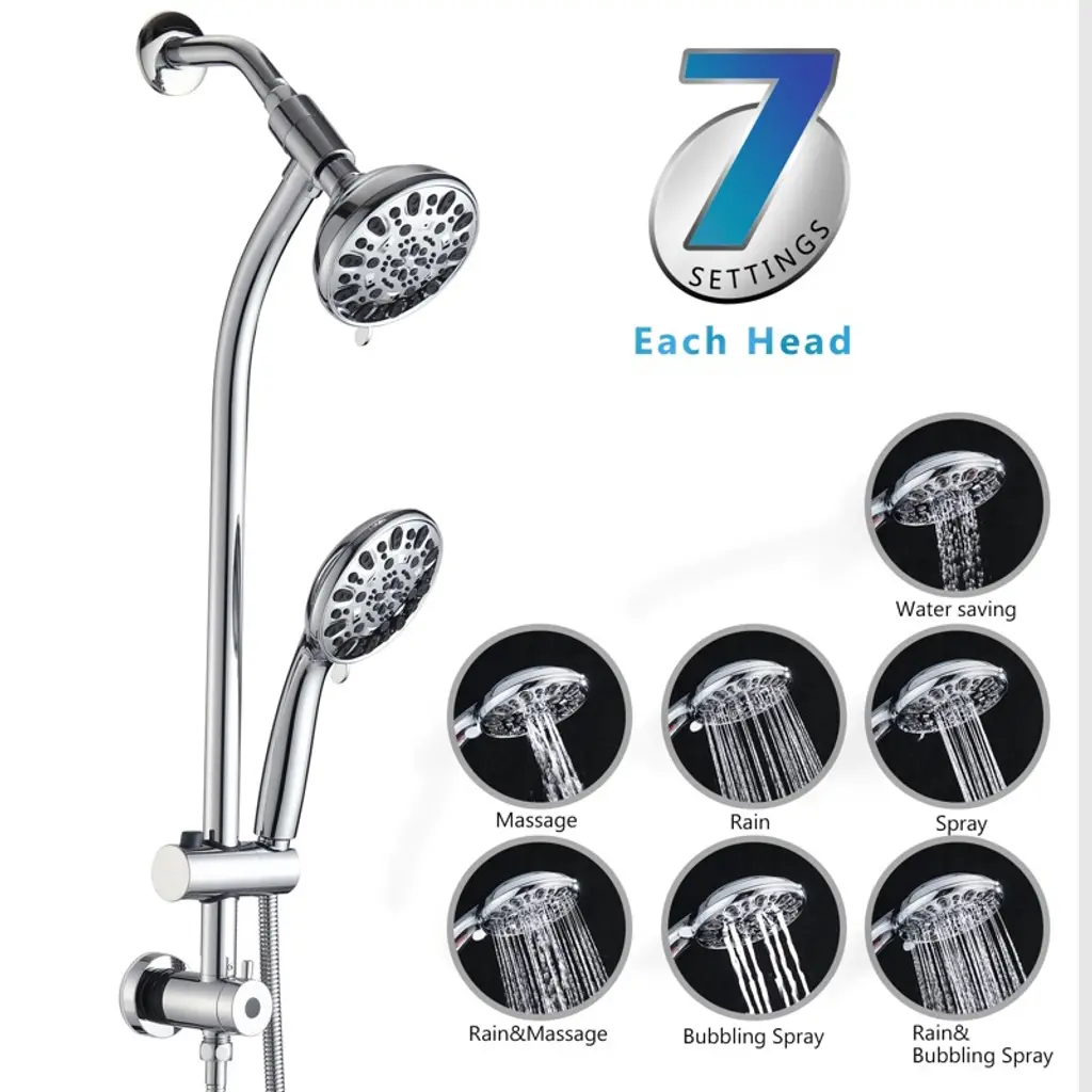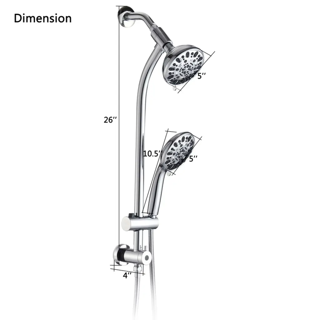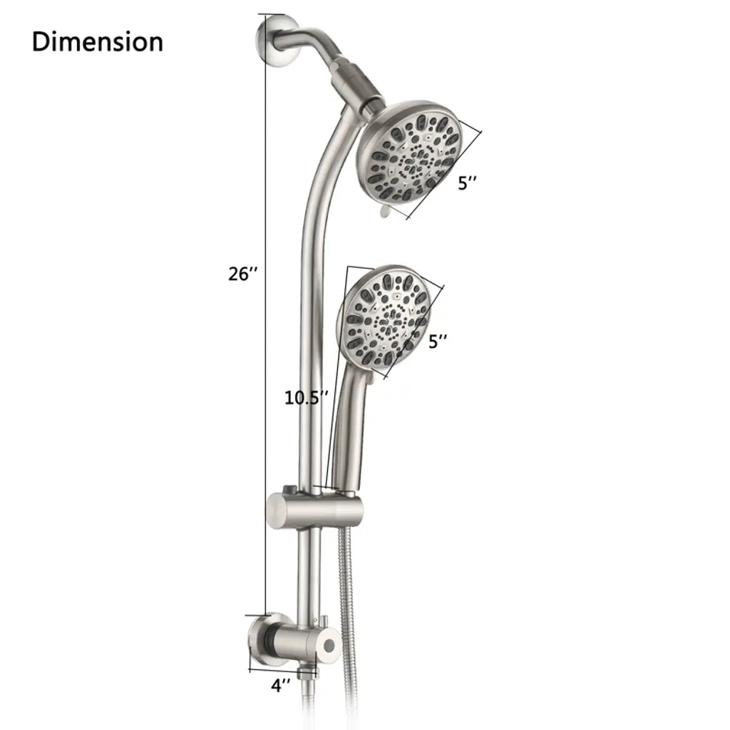 The PROOX 26 in. 2 in 1 sliding rod dual shower heads faucet can be installed immediately without tool, pipe, drilling or wall damage. The deluxe giant 5 in. all chromium alloy angle adjustable rainwater nozzle can provide rain water flow above the head. The high-power 7-function manual shower with water-saving pause mode is an ideal choice for close use and movement. It can be put on the sliding support for hands-free operation or removed from the support for long-distance operation. The revolutionary low water level 3-way diverter at the lower end of the sliding rod can easily switch the water flow to the shower head or combination. These 2-luxury shower heads can be used alone or at the same time, and adopt advanced high-pressure design and friction cleaning nozzle. Settings include: overhead rainfall, dynamic rain, pulse massage, moisturizing fog, rain/fog, rain/massage and water-saving pause mode. The height/angle adjustable hand shower bracket can be adjusted up and down or horizontally, including stainless steel hose, which is connected to the bottom end of the sliding rod for easy installation.