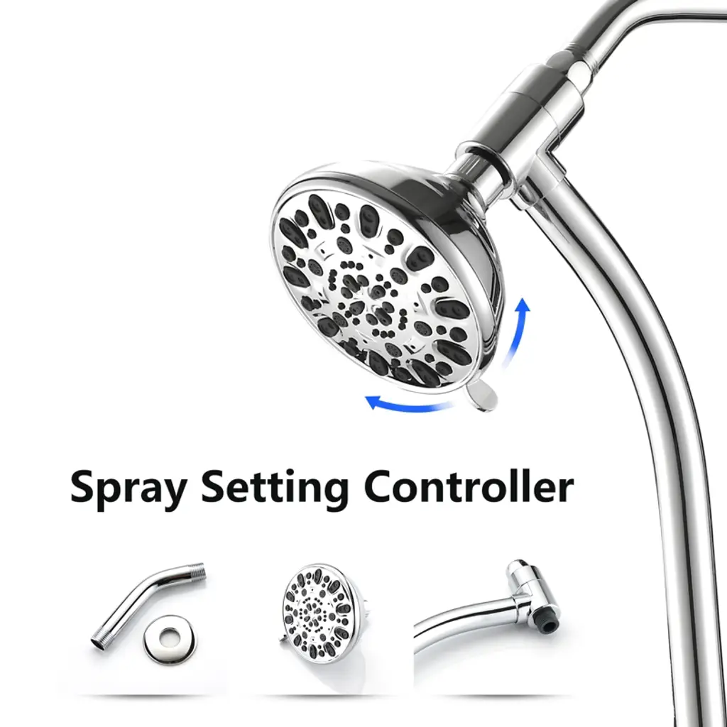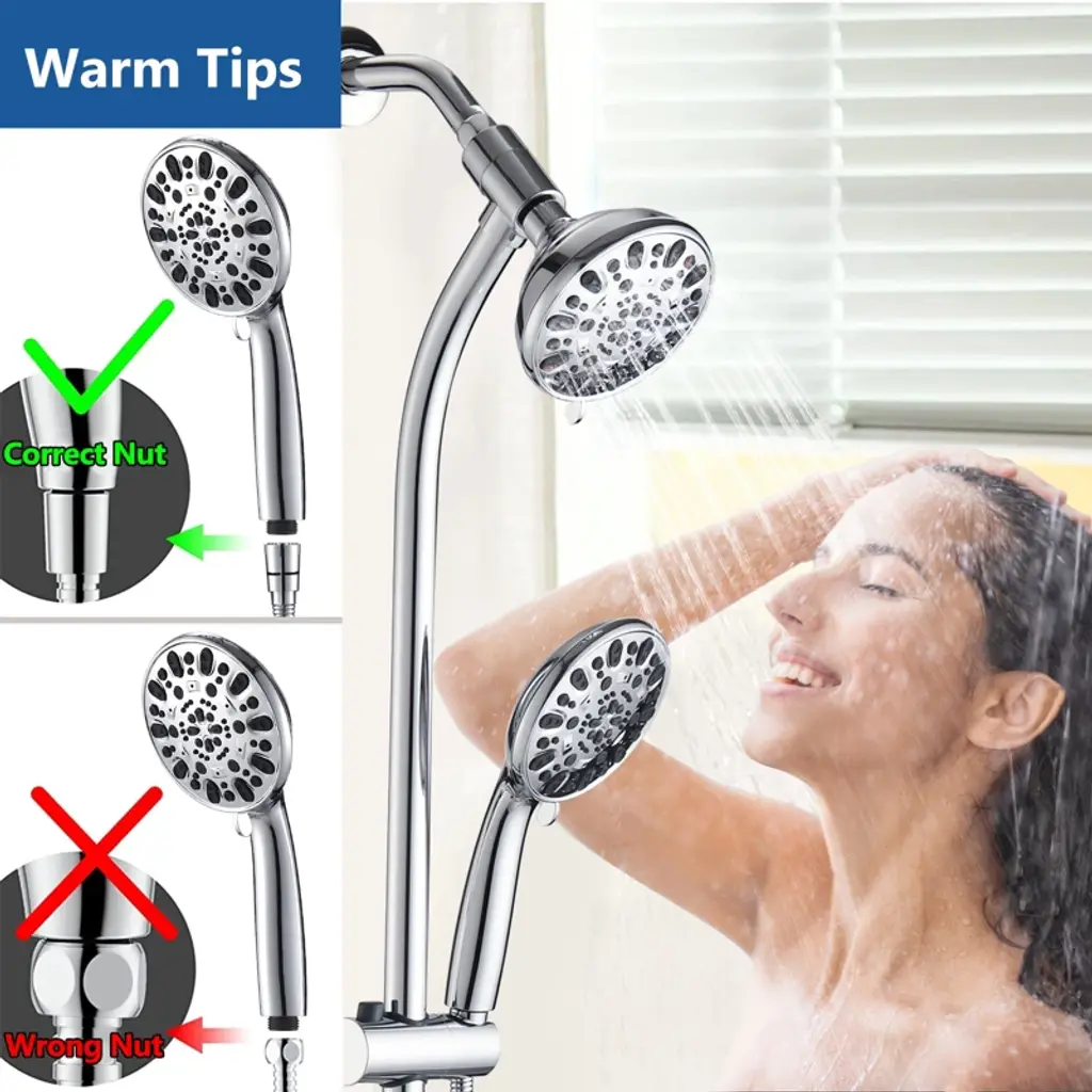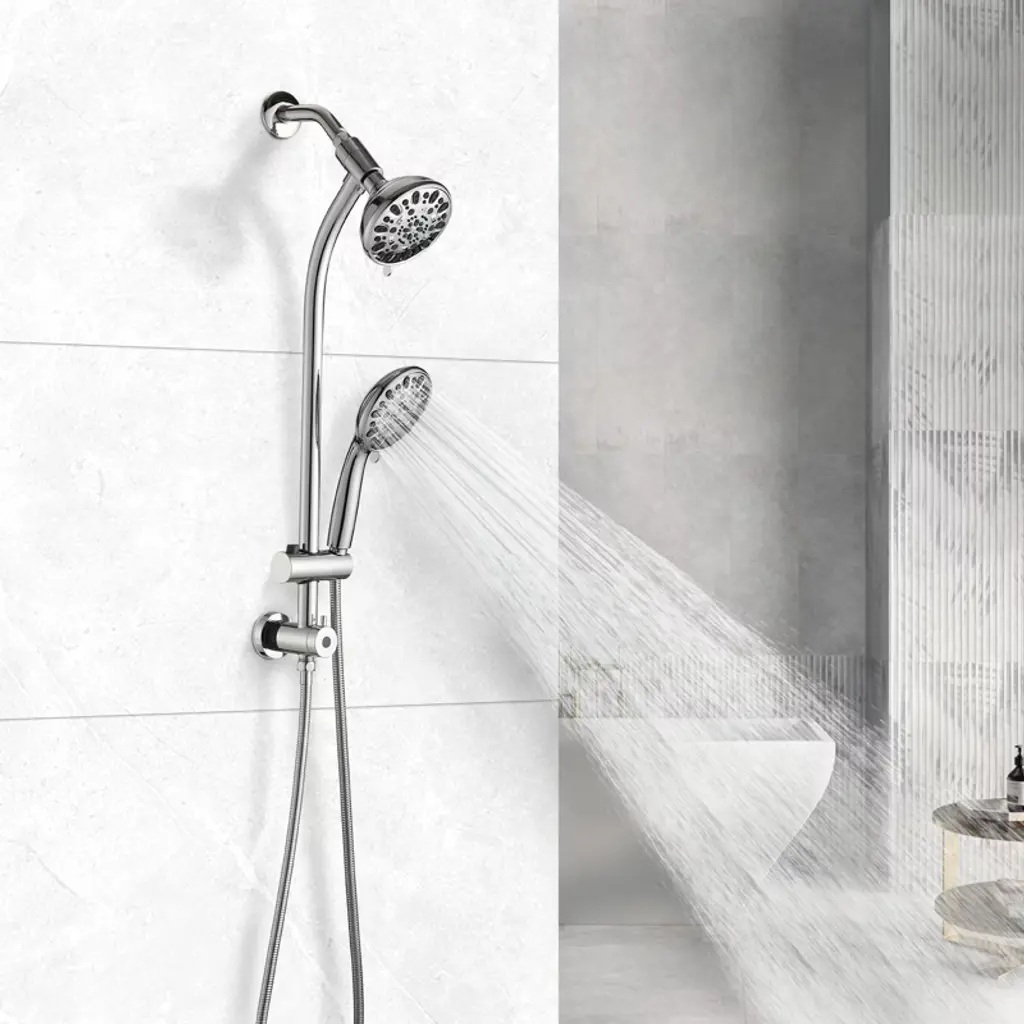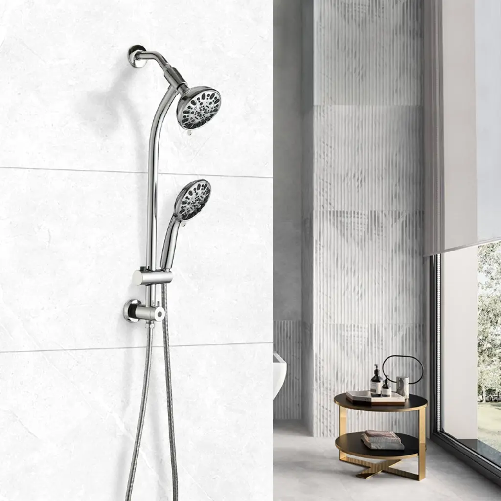 The PROOX 26 in. 2 in 1 sliding rod dual shower heads faucet can be installed immediately without tool, pipe, drilling or wall damage. The deluxe giant 5 in. all chromium alloy angle adjustable rainwater nozzle can provide rain water flow above the head. The high-power 7-function manual shower with water-saving pause mode is an ideal choice for close use and movement. It can be put on the sliding support for hands-free operation or removed from the support for long-distance operation. The revolutionary low water level 3-way diverter at the lower end of the sliding rod can easily switch the water flow to the shower head or combination. These 2-luxury shower heads can be used alone or at the same time, and adopt advanced high-pressure design and friction cleaning nozzle. Settings include: overhead rainfall, dynamic rain, pulse massage, moisturizing fog, rain/fog, rain/massage and water-saving pause mode. The height/angle adjustable hand shower bracket can be adjusted up and down or horizontally, including stainless steel hose, which is connected to the bottom end of the sliding rod for easy installation.