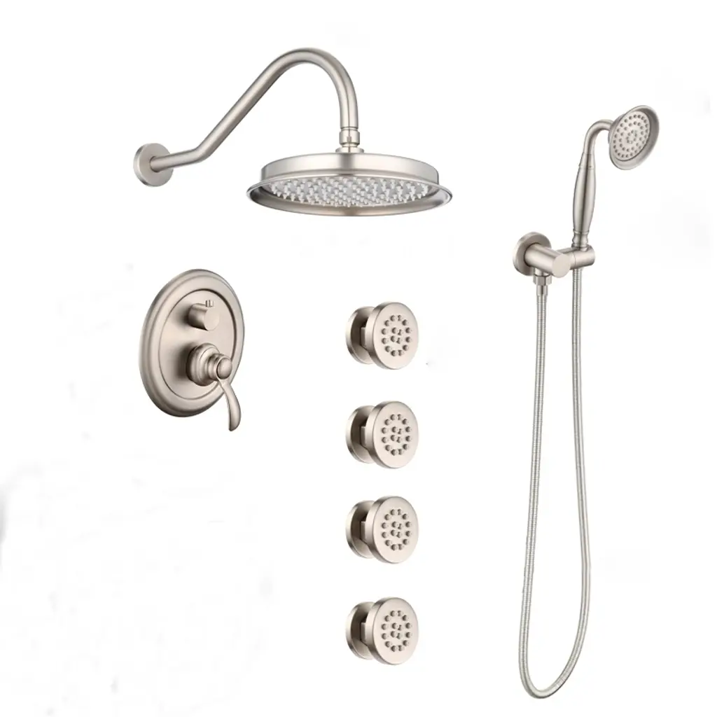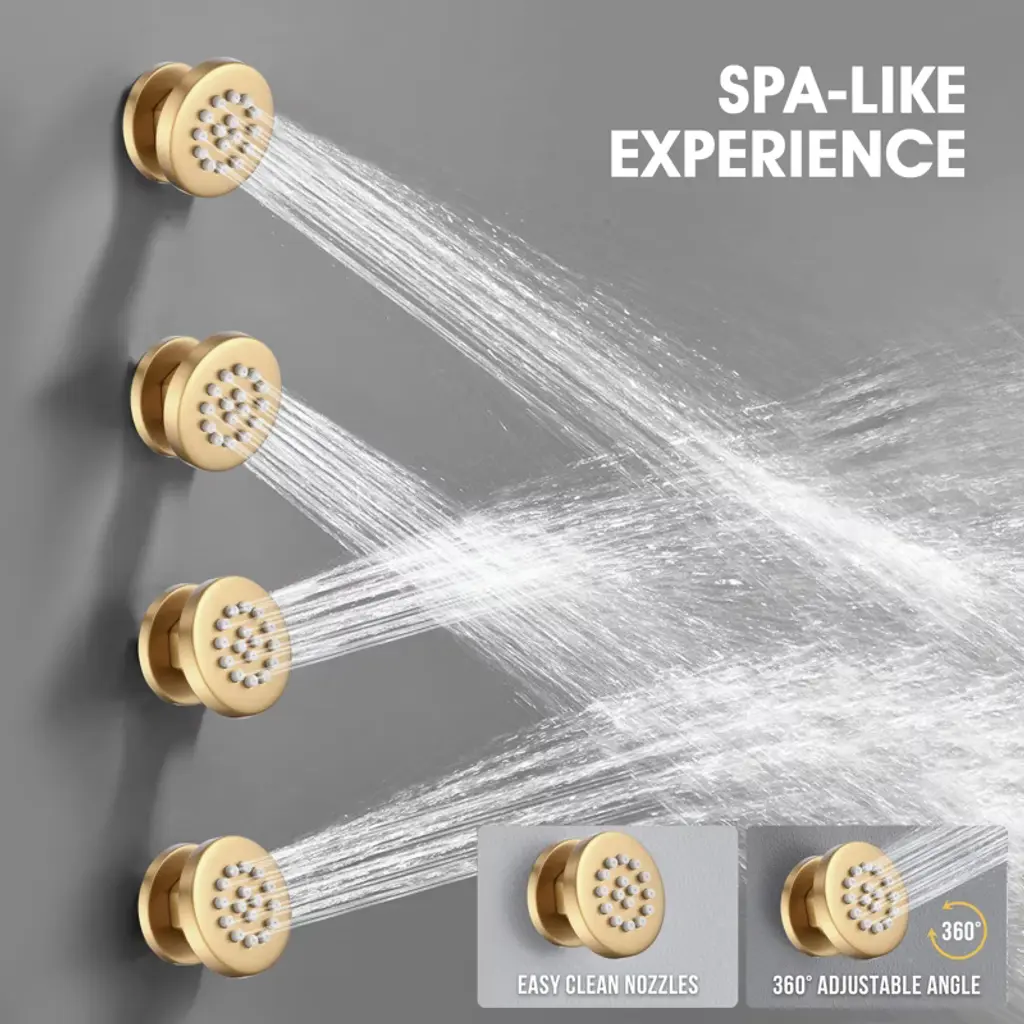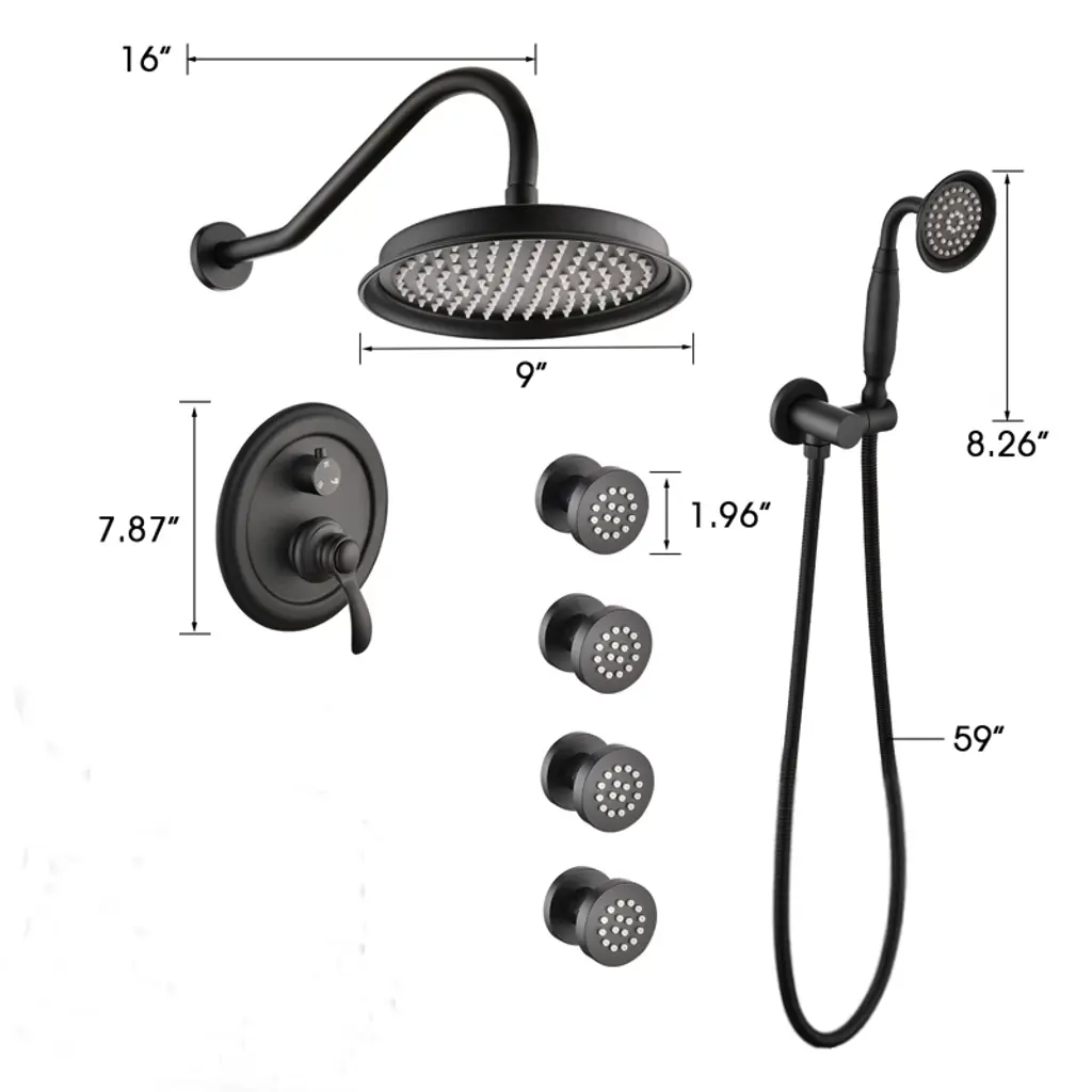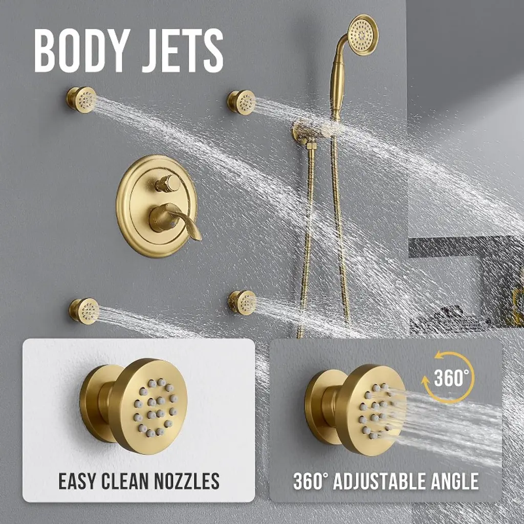The PROOX Rainfall Shower System is designed to provide a luxurious and soothing soaking experience. It features 4-body sprays that gently caress the body, while the hand shower is perfect for manual use. The entire shower faucet can be mounted onto your wall, making it an ideal choice for both large and compact bathrooms. This shower system combines an antique look with modern luxury and will add a touch of elegance to any bathroom.
