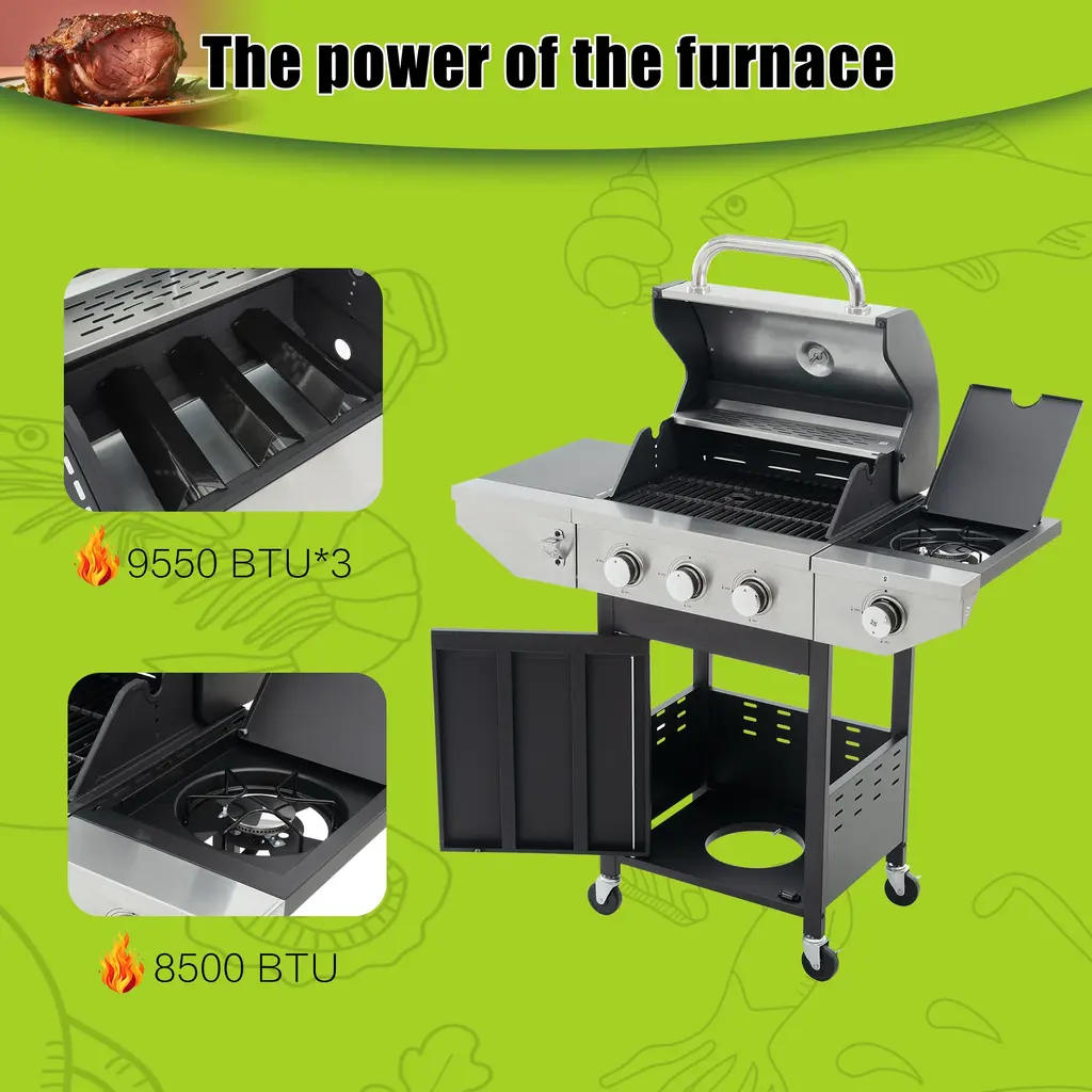 Propane Grill 3 Burner Barbecue Grill Stainless Steel Gas Grill With Side Burner, 37,000 Btu Outdoor Cooking - Black