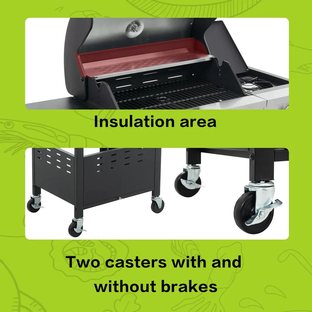 Electronic pulse ignition, fast and convenient.Adopting an advanced electronic pulse ignition system, it ignites with just one click, saying goodbye to the cumbersome manual ignition method and making outdoor barbecues more relaxed and efficient. Independent fire control, precise cooking.The stove surface is equipped with multiple sets of burners, allowing you to adjust the heat according to the needs of the ingredients, easily achieving precise cooking of different ingredients. Whether it's a large steak or vegetables, they can all be cooked to their liking. Stainless steel material and black lacquered cabinet body, with a grand and durable appearance.The upper cover and panel are made of stainless steel, which is easy to clean, corrosion-resistant and has a high-end texture. The main cabinet is painted black, combined with a simple line design, presenting a fashionable and grand overall appearance. Built-in thermometer, allowing you to control the heat at any time.The top of the oven lid is equipped with a thermometer, which can monitor the internal temperature of the oven in real time, ensuring that the baking process is more controllable and avoiding baking failure due to improper heat control.