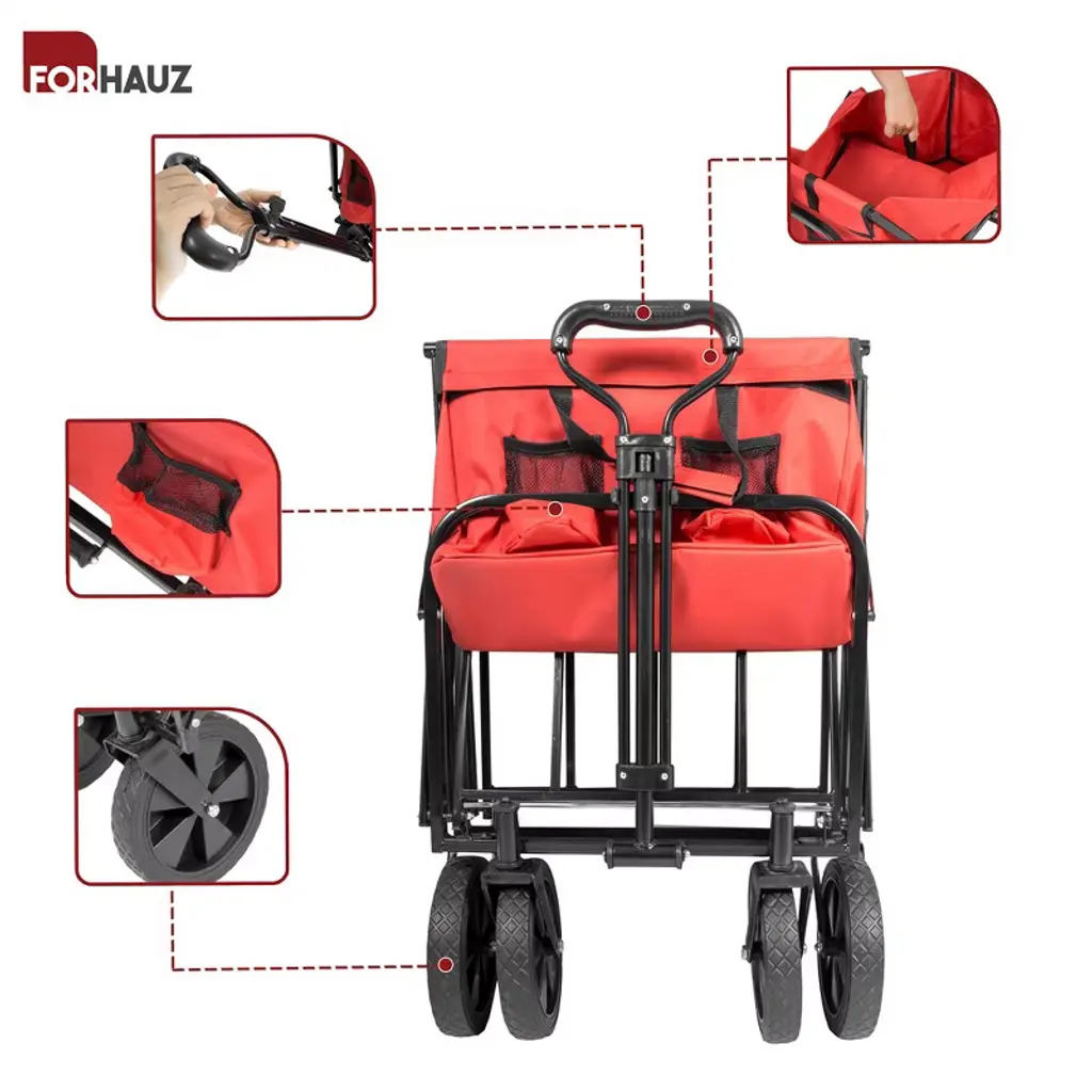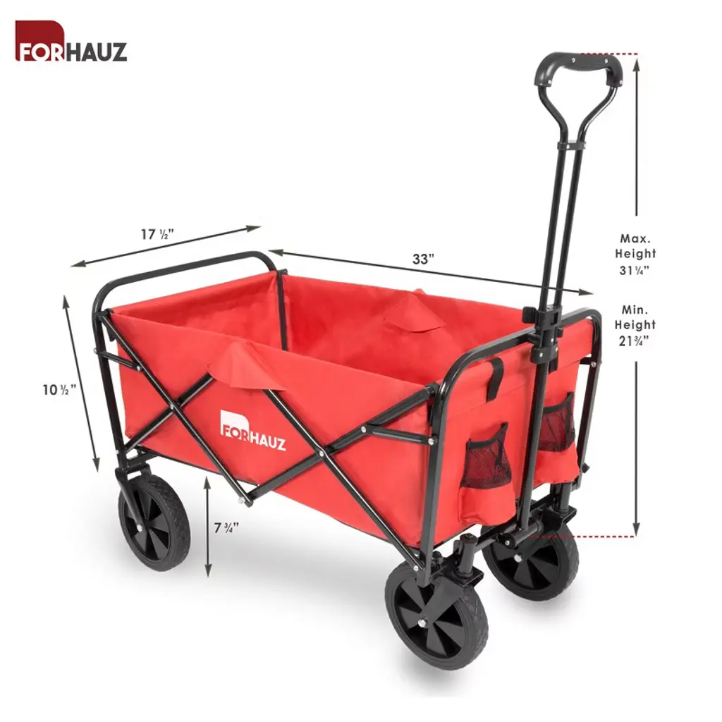 Lighten up your load with the ForHauz Folding Wagon Cart! This heavy-duty utility wagon is designed to carry groceries, tools, toys and everything in between to make your errands easier. Take your wheeled wagon to the beach, park, grocery store and even your backyard garden to haul your items wherever you choose. Carry smaller items like water bottles in the cup holders located at the front of the wagon. The durable wheels allow you to pull your wagon through almost any terrain like dirt, rocks and mud. The front wheels rotate 360 degrees to make steering a breeze when navigating tight paths. When you’re all done using your wagon, fully collapse the cart to stow away in your closet, garage or car. The foldable design saves space and the best part is setup takes seconds!