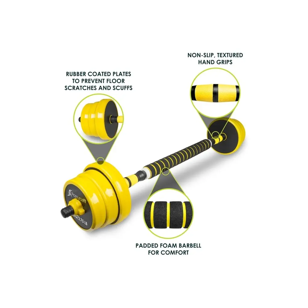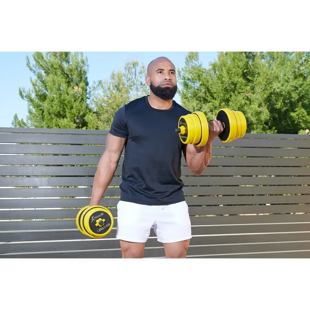 The ProsourceFit 2-in-1 Dumbbell and Barbell set provides versatility for those who are looking for a convenient and efficient workout. The weights feature 2 variations with one up to 22lbs using 8 plates with 4x1kg plates and 4x1.25kg plates and the second variation up to 33lbs with 4x1.5kg and 4x2kg. There are also 2 heavier variations you can choose from using 12 plates with one up to 44lbs with 4x1.25kg, 4x1.5kg and 4x2kg and the second variation includes up to 55lbs with 4x1.5kg, 4x2kg and 4x2.5kg. Get in a full-body workout by using both dumbbells and barbell up to 55lbs to perform bicep curls, shoulder presses, squats, deadlifts and lunges. Perform your best during your workouts and with the proper form with the comfortable features. The free weight set is also secured by spin-lock collars and is comfortable with the non-slip grip and cushioned features of the connecting rod. There is no need to worry about your garage or home gym floors either because of the rubber coated plates. Not only do you save money by buying one piece of equipment but you also save space in your home gym. Everyone is looking for the next best addition to their home gym when they can get the most with one. 2-IN-1 DUMBBELL & BARBELL – Transition from dumbbells to a barbell in seconds! Easily attach the connecting rod to transform the hand weights into a barbell for ultimate versatility. Get your workout done with one piece of equipment.