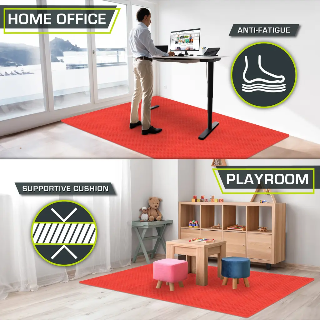 The ProsourceFit Puzzle Mat gym flooring for home gym equipment turns your everyday space into an instant workout space! Six clever tiles (24 square feet of fitness) transform your office into a work gym, your basement into a workout cave, or any room into an exercise space. Need more space? No sweat - snap on extra tiles like puzzle pieces. Plus, say goodbye to rogue desks and treadmill migrations - the checkered surface of the foam mat grips like nobody's business. But the magic doesn't stop there. This EVA foam pad floor is waterproof, shock-absorbing, and versatile enough for burpees, playtime, or just making the floor a little easier on your tired body. So ditch the excuses and embrace the revolution - your versatile floor for exercise is a home gym floor mat away.