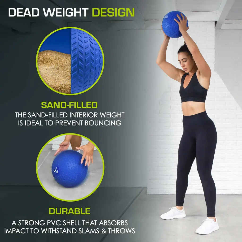 The ProsourceFit Classic Slam Medicine Balls are a fun way to boost your heart rate, get a full body workout, and beat stress! A thick, durable rubber shell is built to take a beating from ball slams, wall throws, tossing with a partner and more. These explosive exercises are a great way to strengthen the core, arms, back, and legs, as well as improve overall coordination. The gentle texture on the classic Slam Ball provides quality grip and is easy on hands, ideal for intense, sweaty workouts and even more traction for throwing. The sand-filled dead weight ball means there is no bounce when you throw, so you can slam as hard as you can without it flying back or rolling away. Perfect for a heart-pumping workout and stress reliever. Use this ball for powerful, dynamic exercises like overhead slams, rotational wall throws, and wall balls. Or use in place of weights for muscle-building exercises like Russian twists, squats, lunges, overhead presses and more. Fitness weight balls come in various weights, making them perfect for beginners and advanced athletes alike. Use weighted fitness balls in your home gym, athletic training facilities, or outdoors for a slammin' workout!