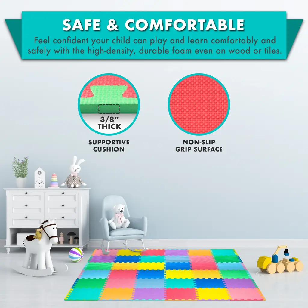 The ProSource Kids Solid Puzzle Play Mat creates a brightly colored, comfortable and safe play area for children wherever you have hard floors. Colorful puzzle pieces and borders will help promote your baby's brain growth and development, making it ideal for homes, child care providers, schools, and churches. The gently textured surface provides a non-slip grip for extra safety, and the 3/8-inch thick high-density EVA foam provides durable cushion for your child. It's also water-resistant, making it easy to clean and keep free from odors. It covers a total of 36 square feet when fully assembled or if you prefer a smaller piece to make it convenient for your space, the 16 square feet can accommodate your needs when fully assembled. The mat can be customized by using only some of the tiles for smaller areas, or by purchasing an extra set to create a larger play area. Each tile is approximately 12 square inches, and it comes with 24 border pieces for a finished look. Soft but firm interlocking pieces are easy and quick to assemble or take apart in case you need to quickly store it away or move it to another room. The lightweight play mat comes in a zippered bag which you can keep to transport or store your mat. This mat does not contain any toxic phthalates.