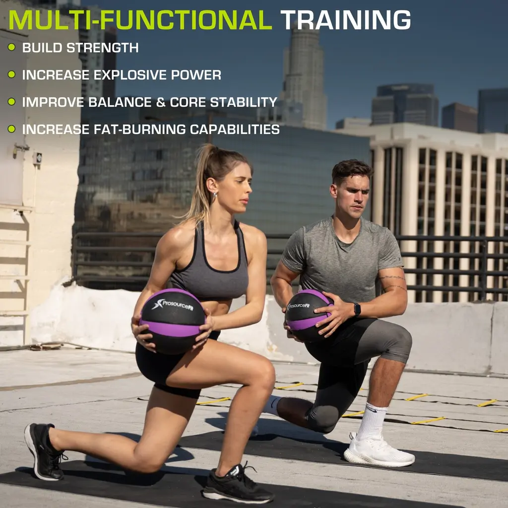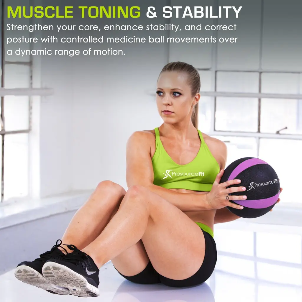 ProsourceFit Rubber Medicine Balls are a convenient and versatile piece of training equipment for improving strength, coordination, and conditioning. The textured rubber surface provides a stable grip, ideal when tossing and catching the ball with a partner or against a wall. When your hands get sweaty from an intense workout, it offers a more secure grip during exercises to prevent slipping. Each ball is super durable, providing a moderate amount of bounce and withstanding heavy use, ideal for boot camps, group fitness instructors, personal trainers, or coaches. Available in five different weights, medicine balls can replace dumbbells in many exercises like squats, presses, and various core exercises. They are perfect for beginners to working out for building strength and coordination, and equally ideal for athletes and anyone working on explosive power. They're a great exercise tool for training athletes of any level, building core strength, cardio conditioning, and multi-joint exercises. Their compact size and affordability are a perfect fit for home gyms and taking your workout outside. Plus, they add variety and make workouts more fun!
