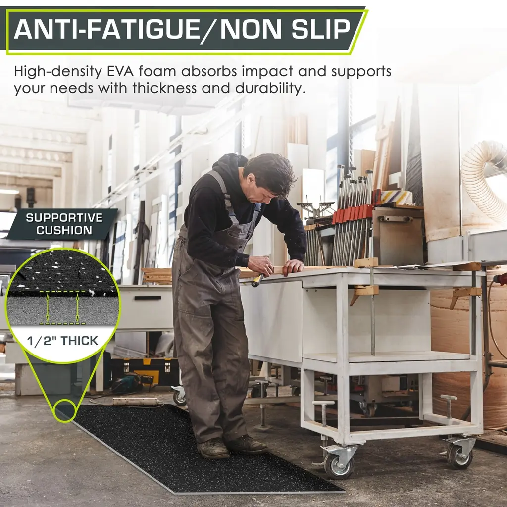 The ProsourceFit Rubber Top Exercise Puzzle Mat 1/2 inch is the perfect flooring to turn any space into a fitness area. Protect your floors and yourself during workouts with these 1/2-inch dual-layer tiles. The rubber top is a durable, textured surface to prevent slips and resists water. The bottom layer of high-density EVA foam creates a sturdy cushion that absorbs impact from equipment and high-impact exercises. Easily assemble exercise tiles with jigsaw edges and connect the border pieces for a clean, polished look. The puzzle edges securely interlock each tile so they stay in place while you exercise. Perfect for gyms, garages, basements, playrooms and more!